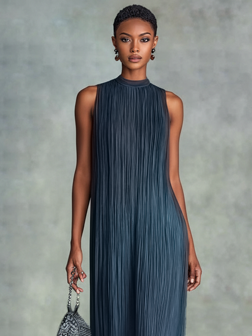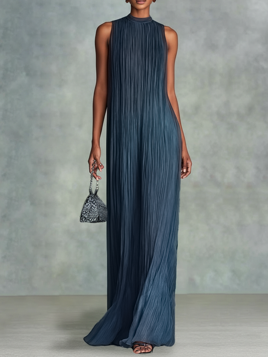 Women's Minimalist Chiffon Pleated Sleeveless Straight-cut Maxi Dress MDZ1239A7Y