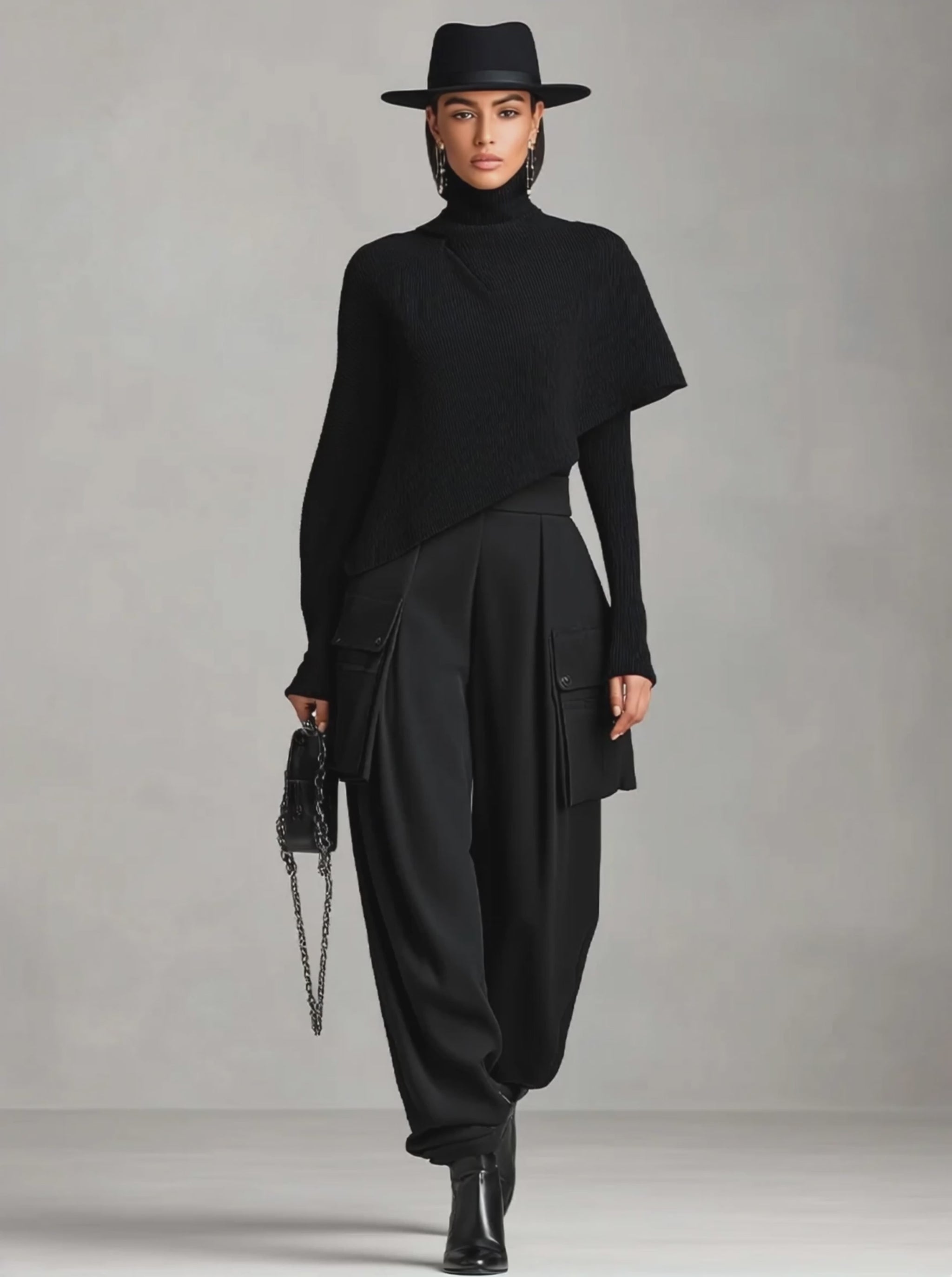 A black ribbed knit top paired with structured woven cargo pants. It’s modern, edgy, and great for bold street-style looks.
