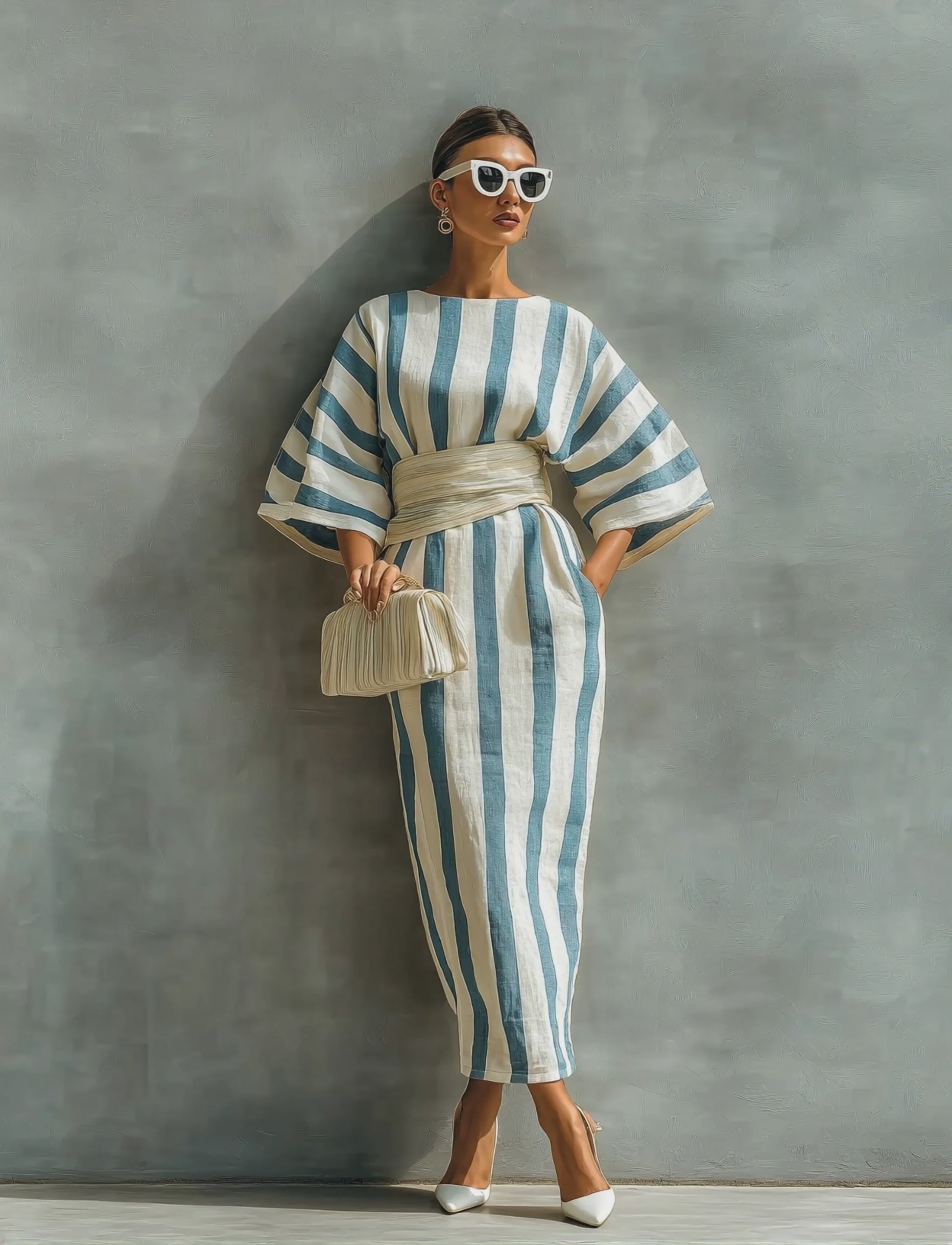 Product Name: Women's Elegant Striped Print Batwing Sleeve Short-Sleeve Maxi Dress (Belt Not Included)