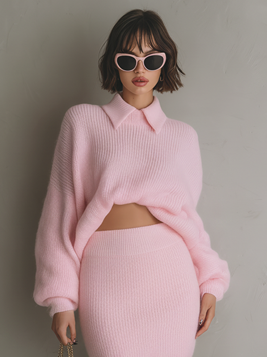 Women's Minimalist Knitted Batwing Sleeve Sweater And Skirt Set MDA1574L0Y
