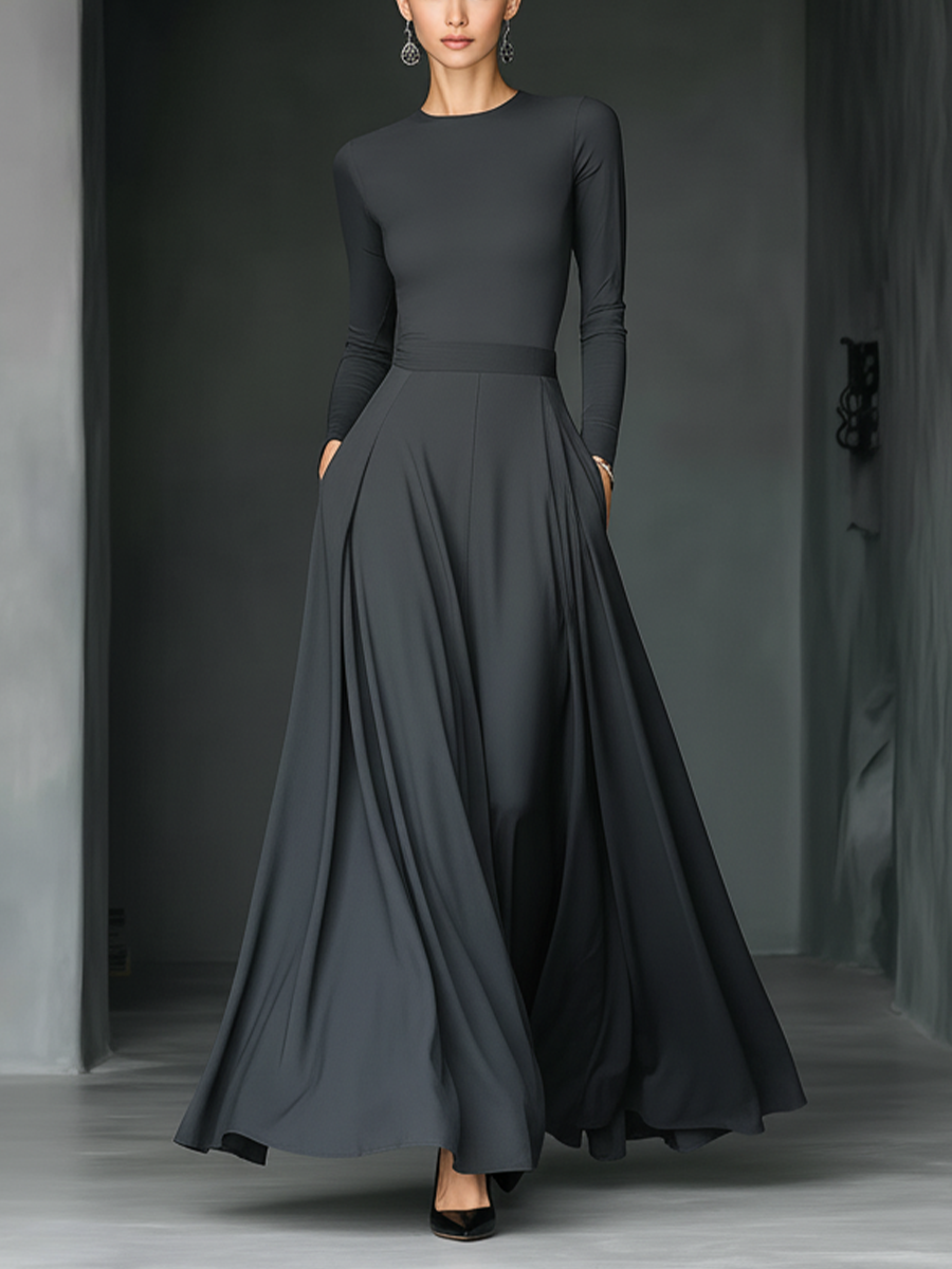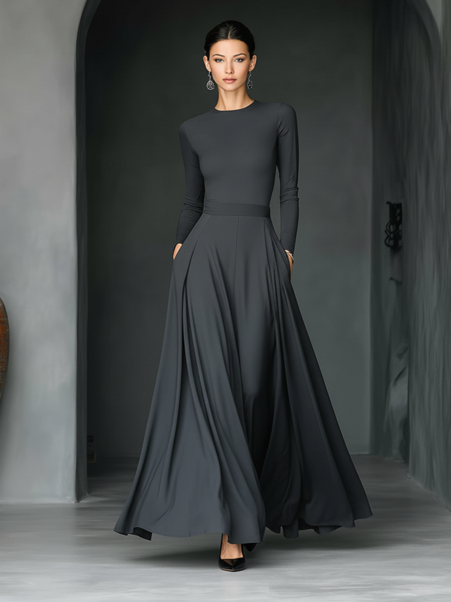 Women's Charcoal Gray Stretchy Knit Slim-fit Long-sleeved Flowing Maxi Dress With Pockets MDA1625L6T