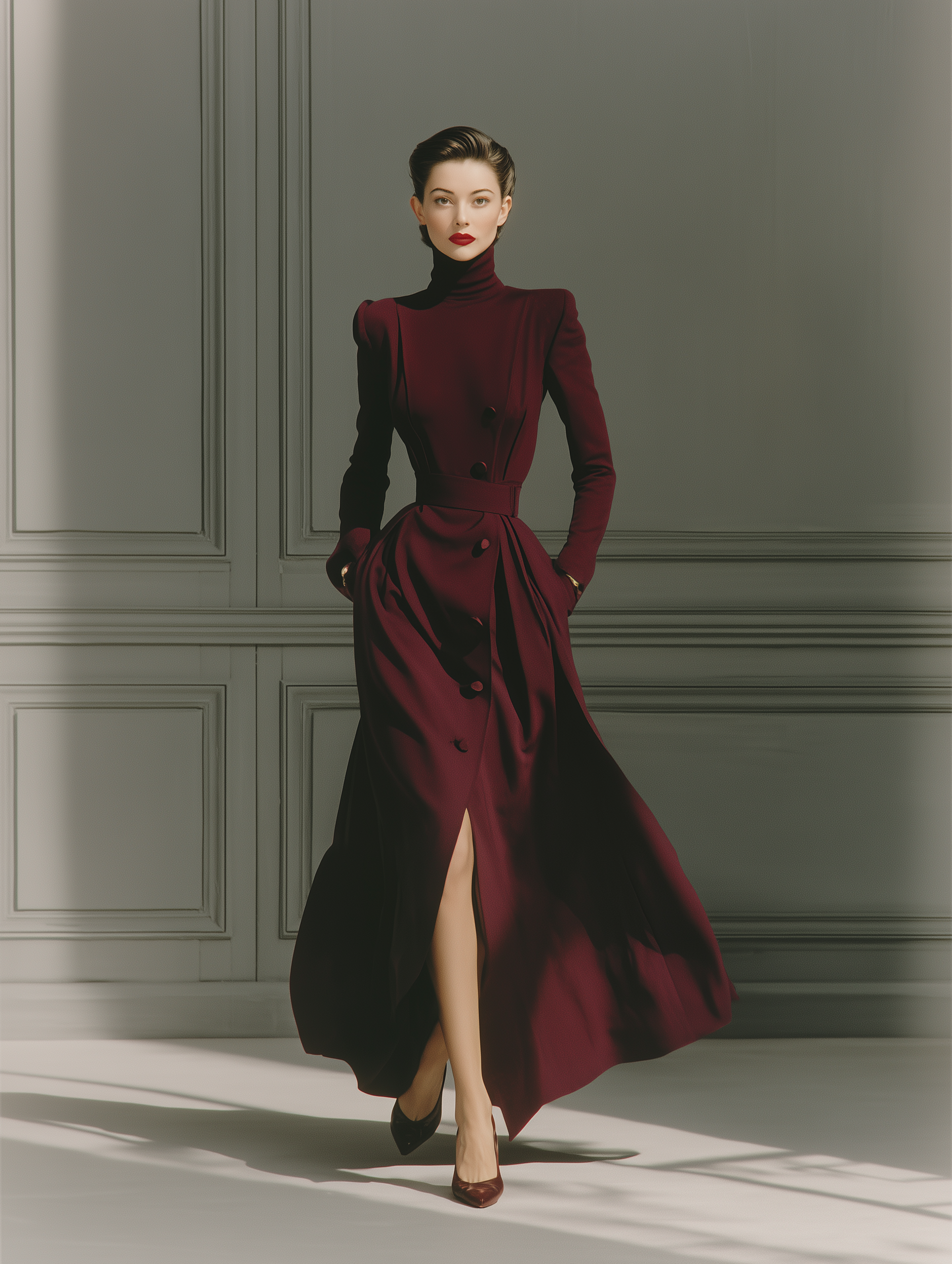 Women's Burgundy Slightly Stretchy Knitted Turtleneck Long Dress With Belt And Side Slit MDA1604L1T