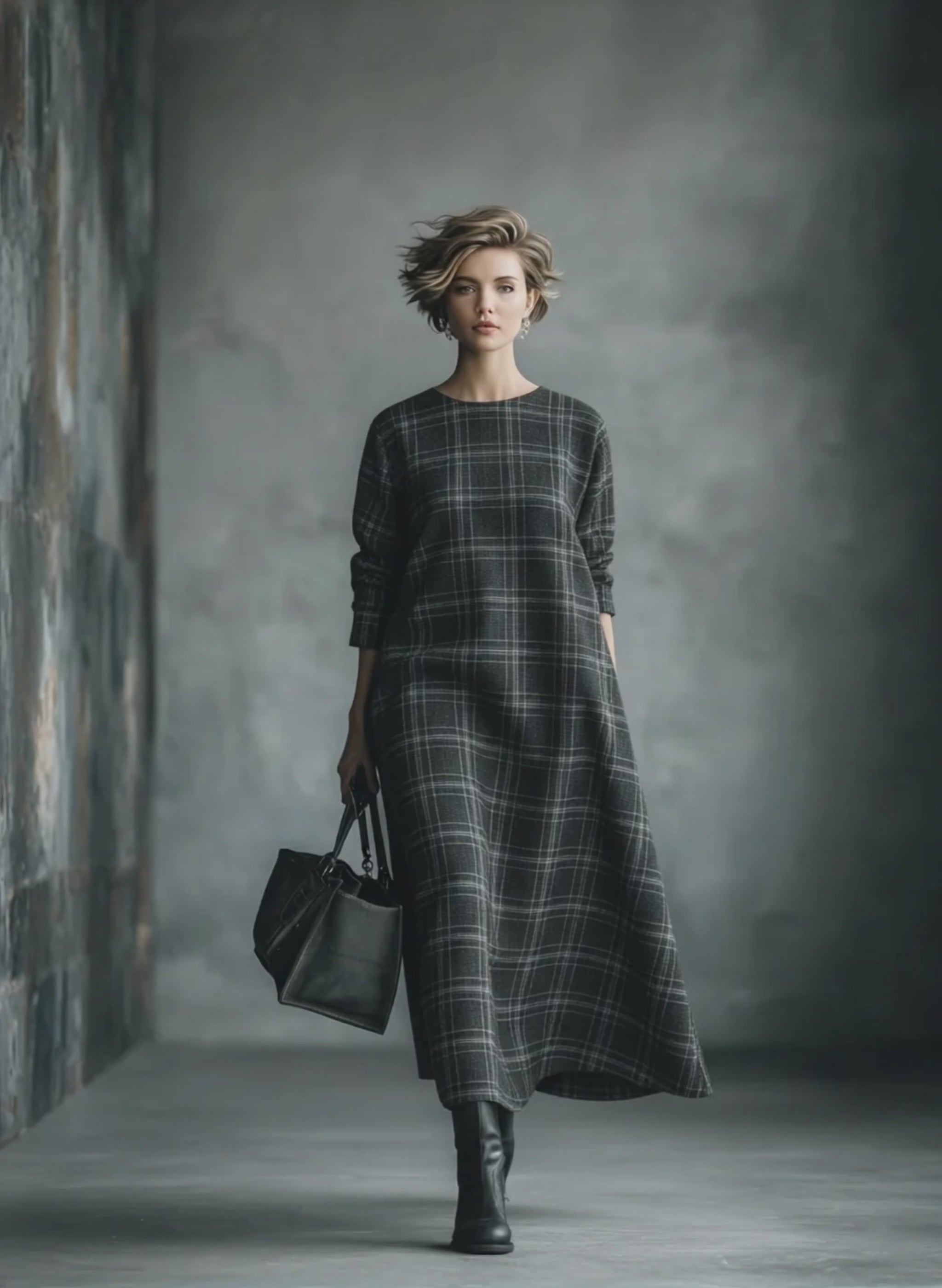 A warm plaid woolen maxi dress with a relaxed silhouette and long sleeves for a chic, cozy look.