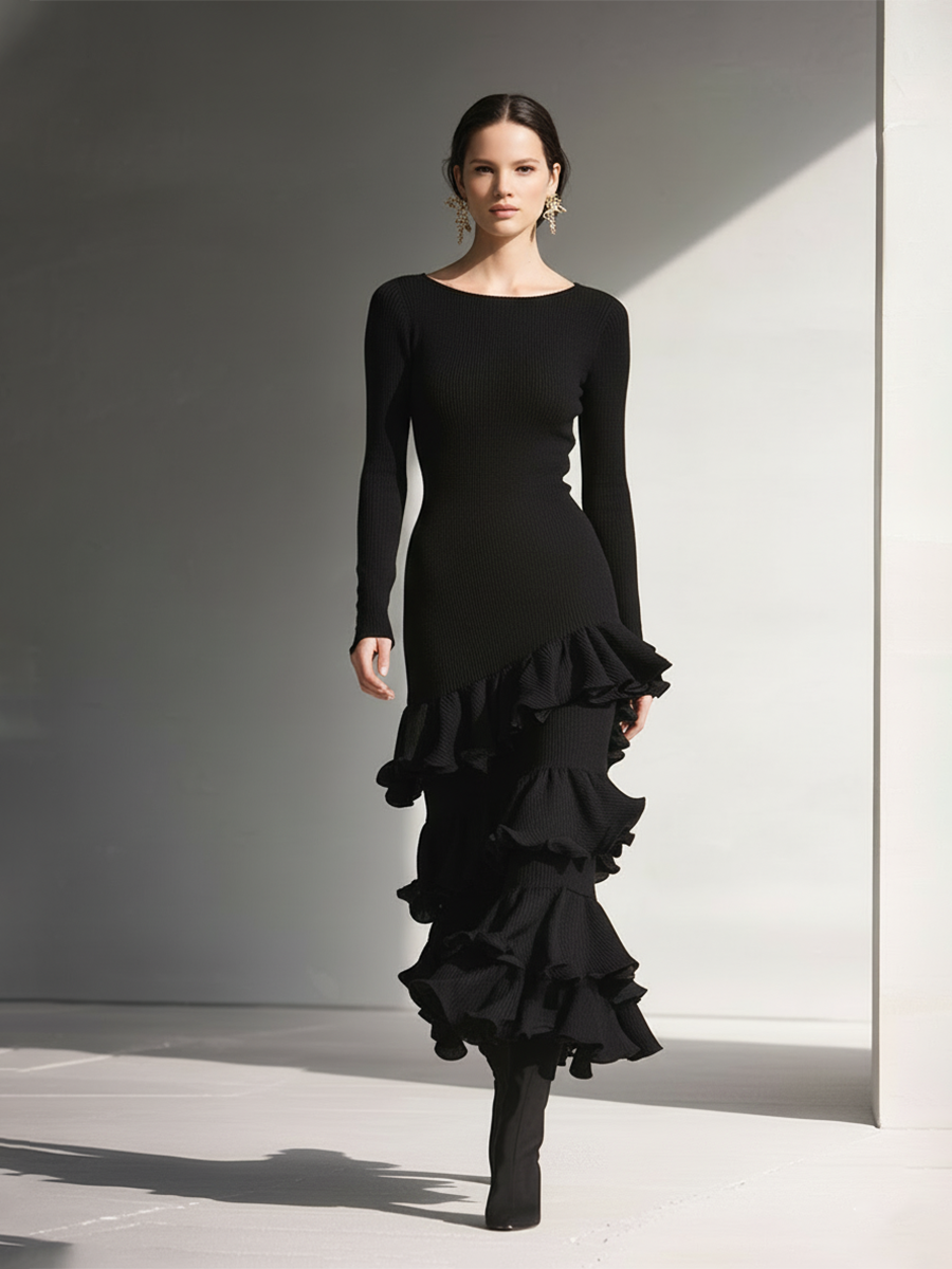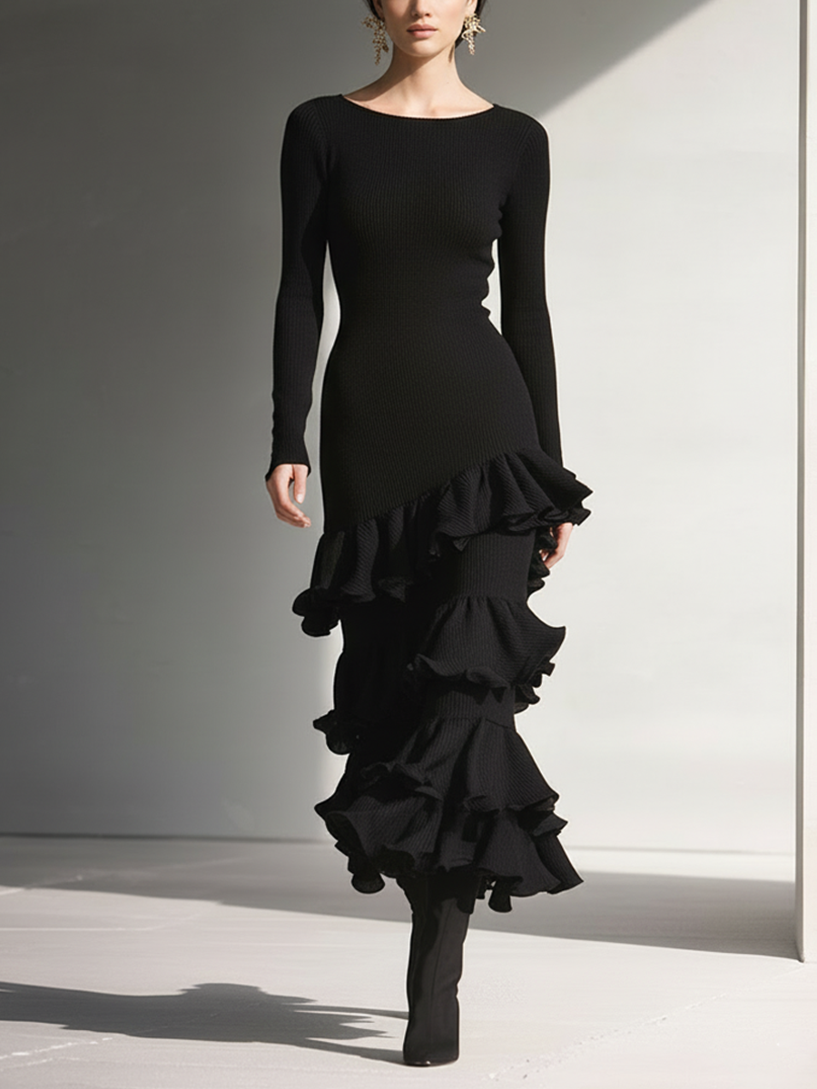 Women's Black Ribbed Knit Layered Ruffle Midi Dress MDA2295L2AP