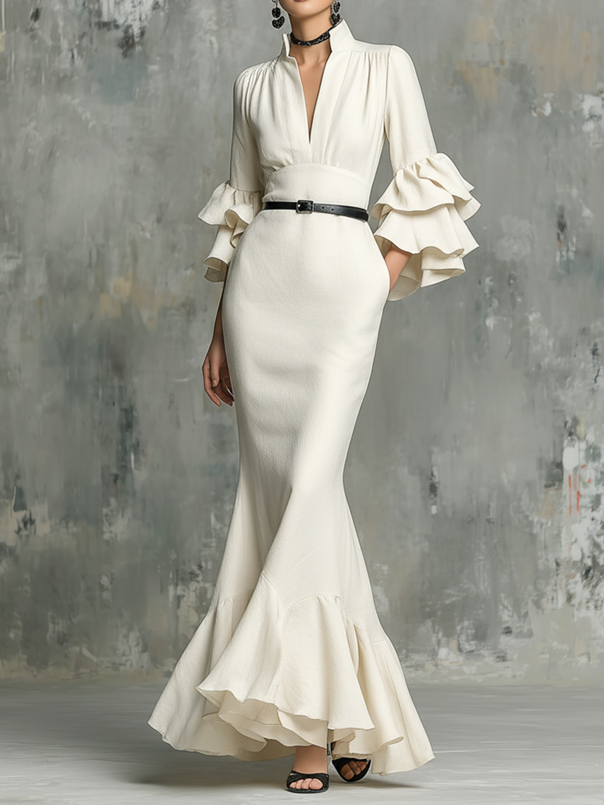 Women's Linen Blend Maxi Dress With Ruffled Sleeves And Belt MDA1747L0Y