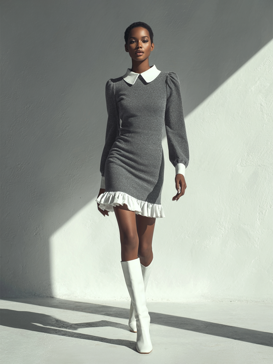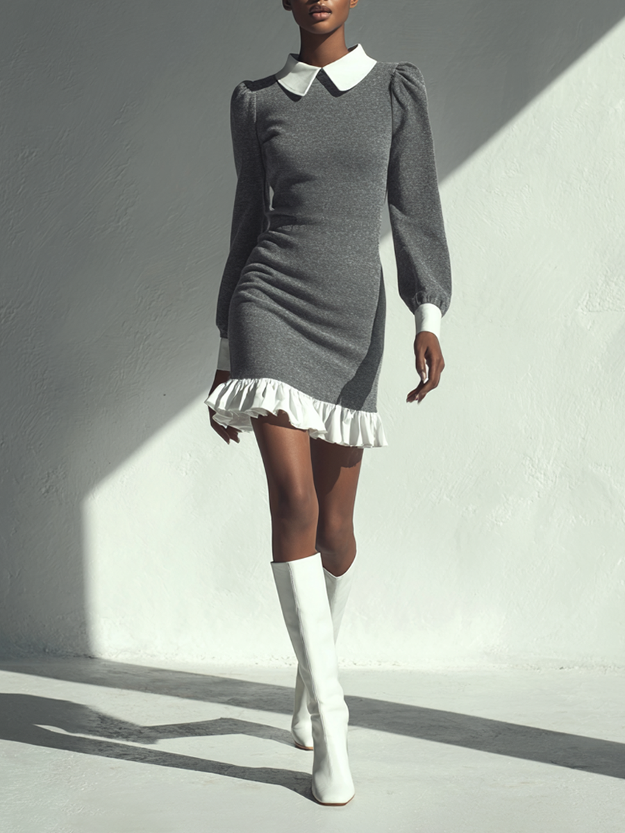 Women's Gray Knitted Contrast Collar Ruffle Hem Mini Dress MDA2253L6AP