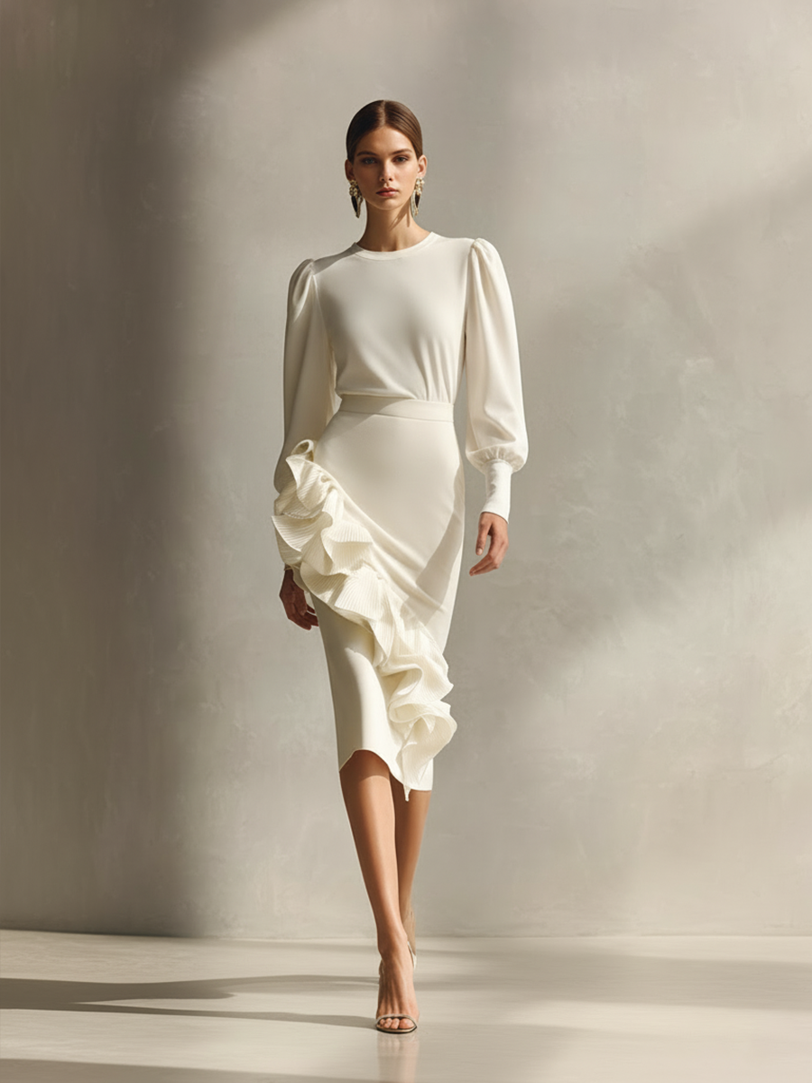 Women's Ivory Long-Sleeved Puff-Sleeve Slim-Fit Midi Dress Two-Piece Set MDA2069L4AP