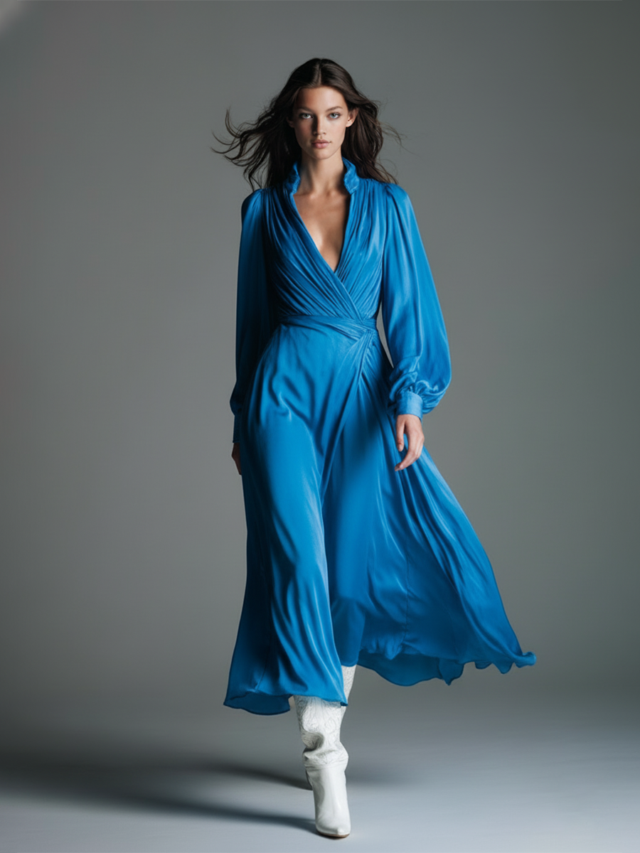 Women's Bright Blue Satin Wrap-Style Puff-Sleeve Long Dress MDA2249L5AP