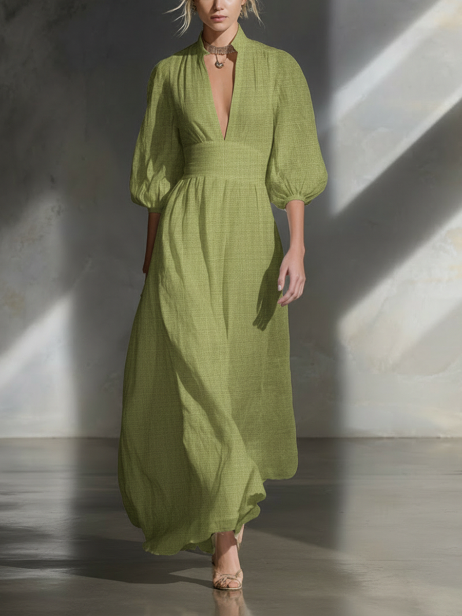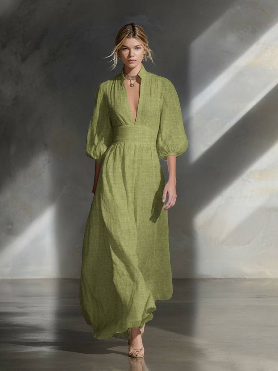 Women's Olive Green Deep V-Neck Puff Sleeve Ruched Waist Long Dress MDA2058L3AP