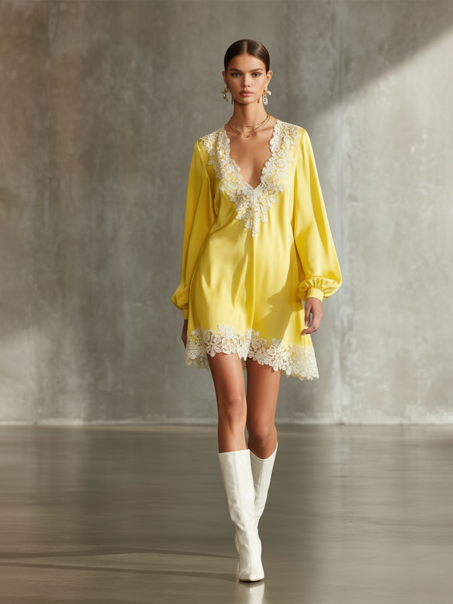 Women's Bright Yellow Satin Lace-Trimmed Puff Sleeve Mini Dress MDA2272L0AP