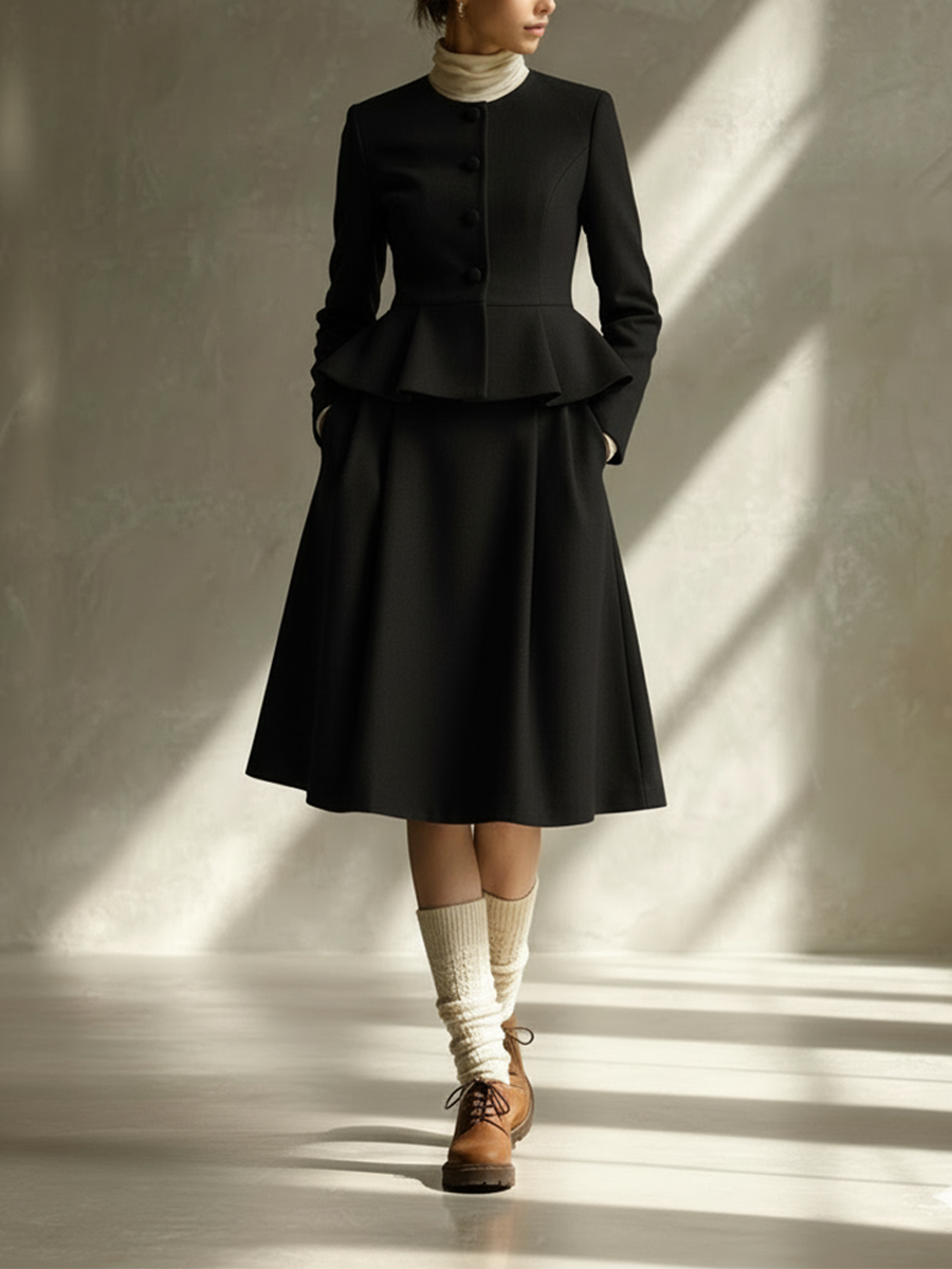 Women's Black Ruffle Trim Jacket And A-Line Midi Skirt Two-Piece Set MDA2250L7AP