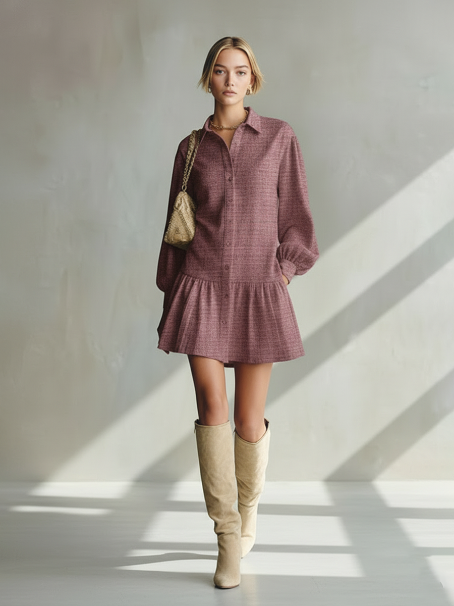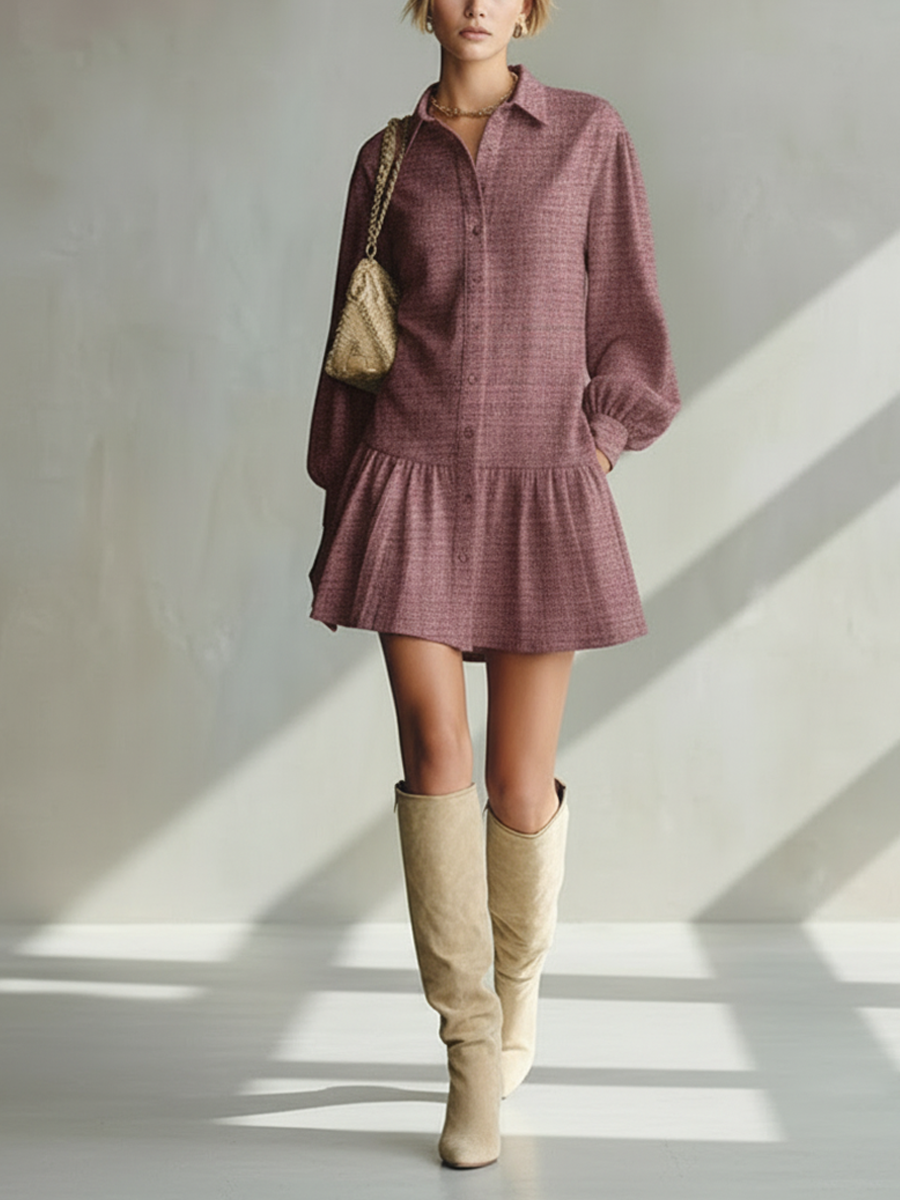 Women's Pink Lapel Long-Sleeve Ruffle Hem Shirt Dress MDA2049L6AP