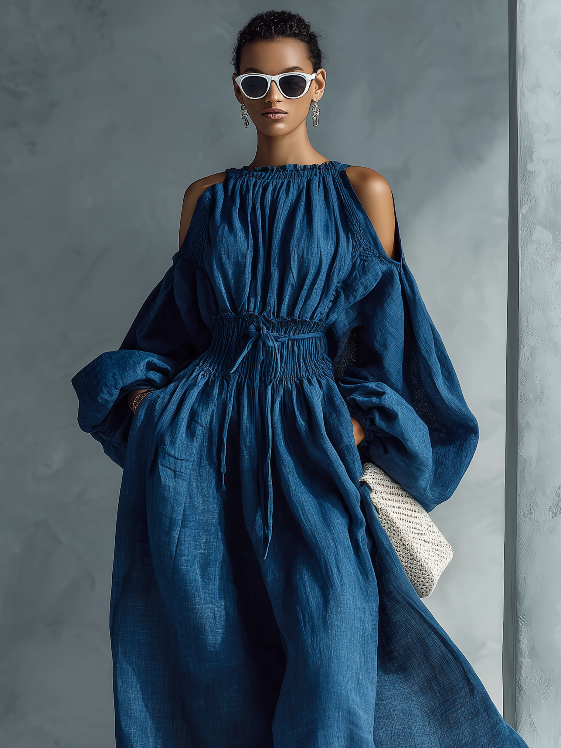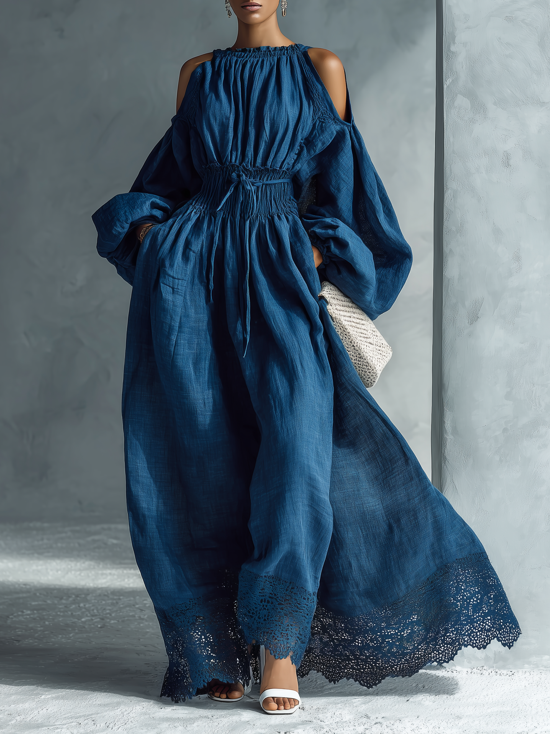 Women's Linen Blend Shoulder Cutouts And Lace Hem Maxi Dress MDA1875L8Y