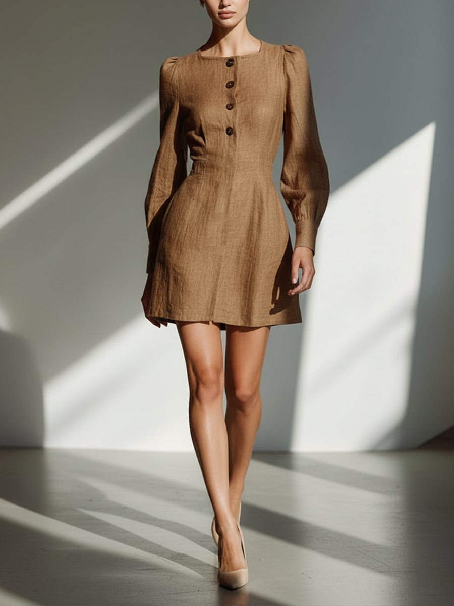 Women's Camel Round Neck Puff Sleeve Button-Front Mini Dress MDA2061L9AP