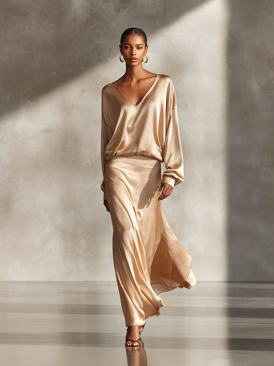 Women's Champagne Satin V-Neck Long-Sleeve Loose Top And Long Skirt Two-Piece Set MDA2052L2AP
