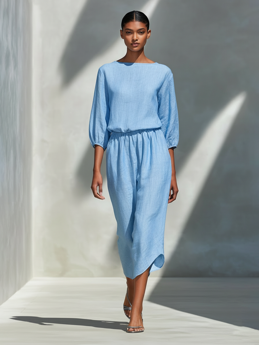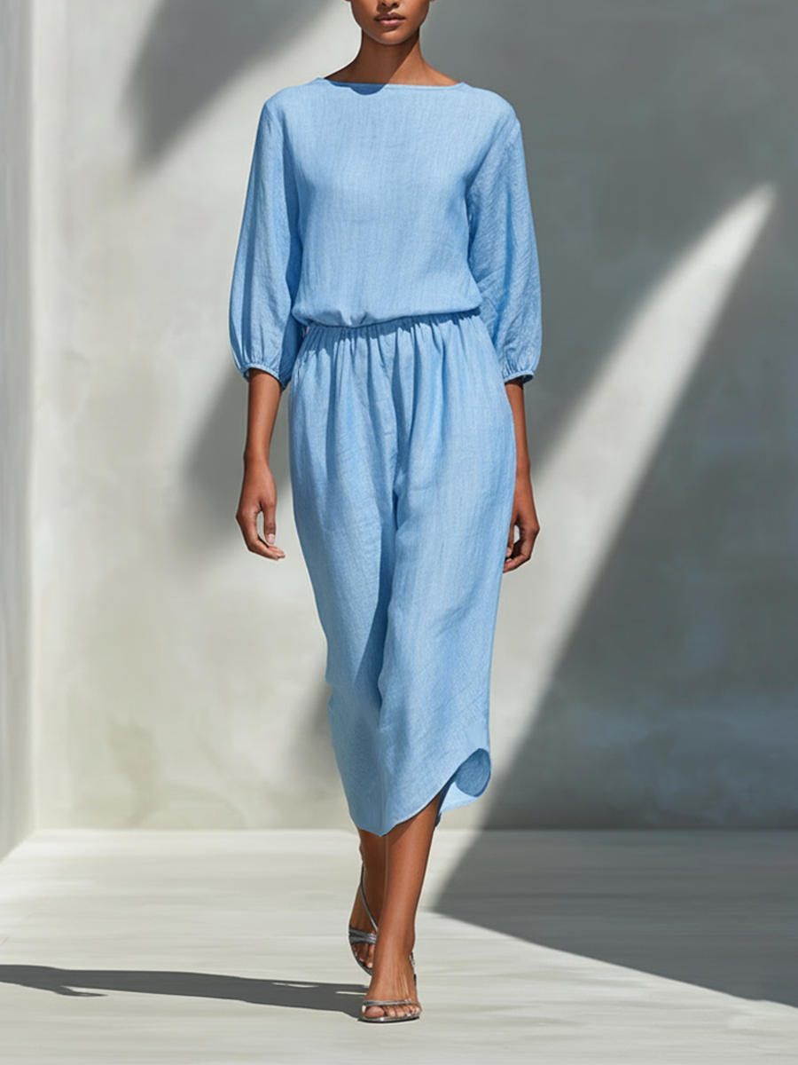 Women's Light Blue Boat Neck Three-Quarter Sleeve Top And Skirt Set MDA2018L1AP