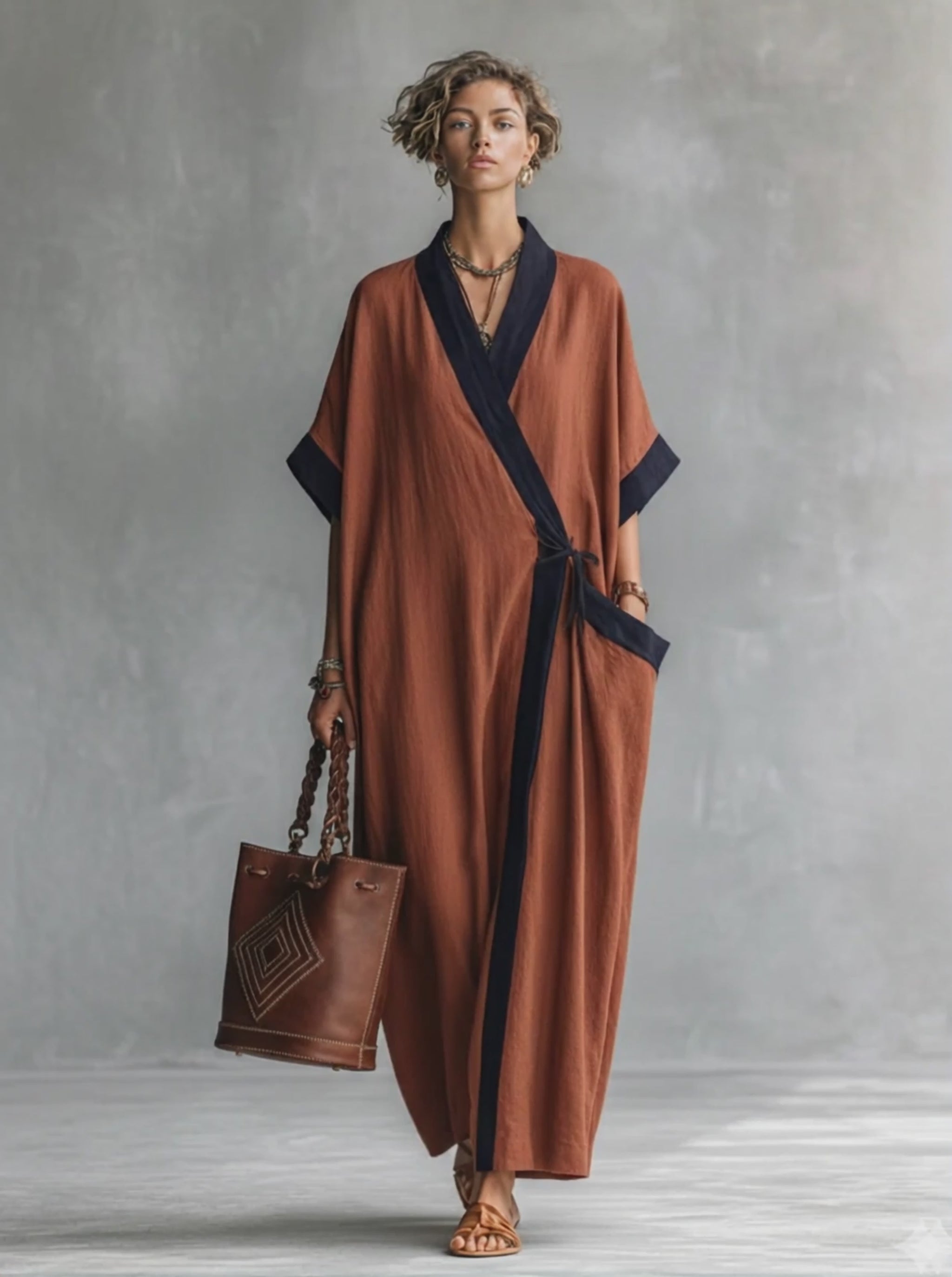 This bohemian-inspired maxi dress features a unique rust-colored fabric with contrasting black trim, designed in a relaxed wrap-around kaftan style. The deep V-neckline and wide, flowing sleeves contribute to its effortless elegance. With an adjustable side tie, it offers a customizable fit that is both comfortable and chic. Perfect for resort wear, casual outings, or a stylish daily look.