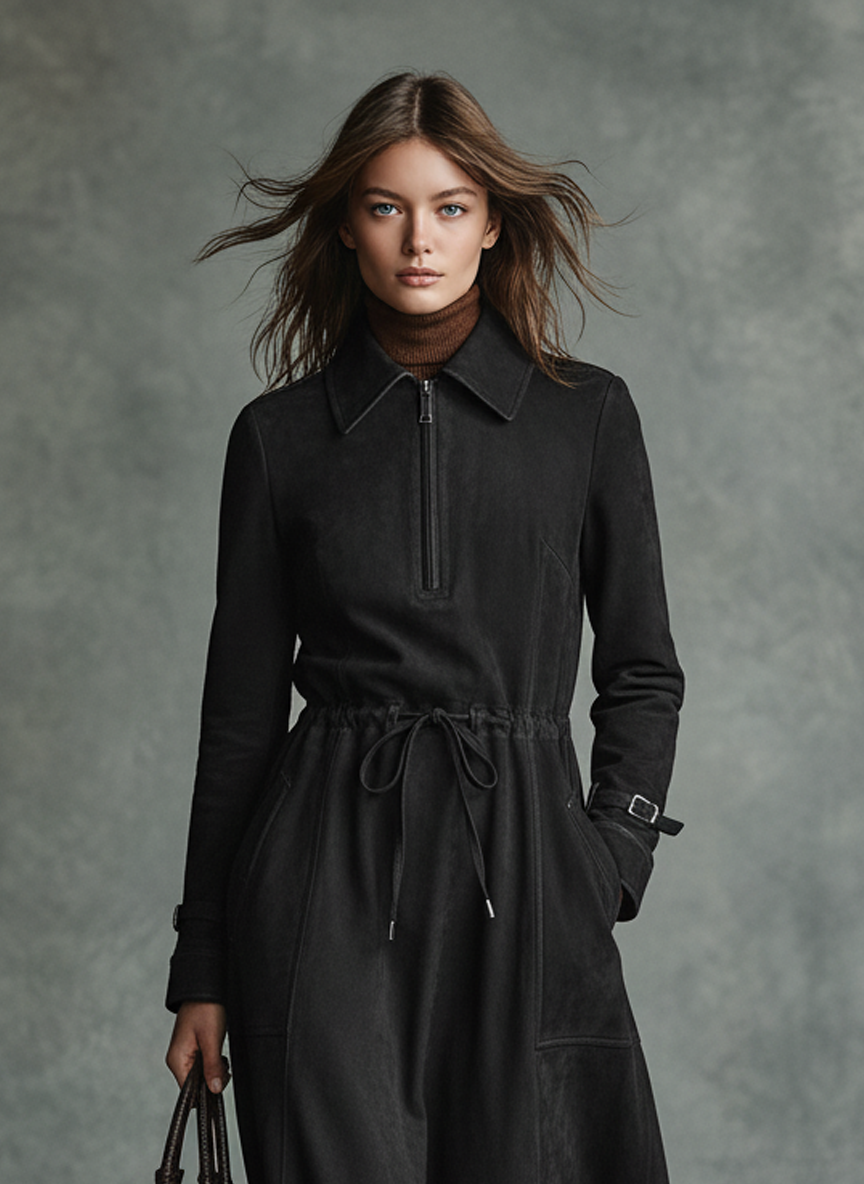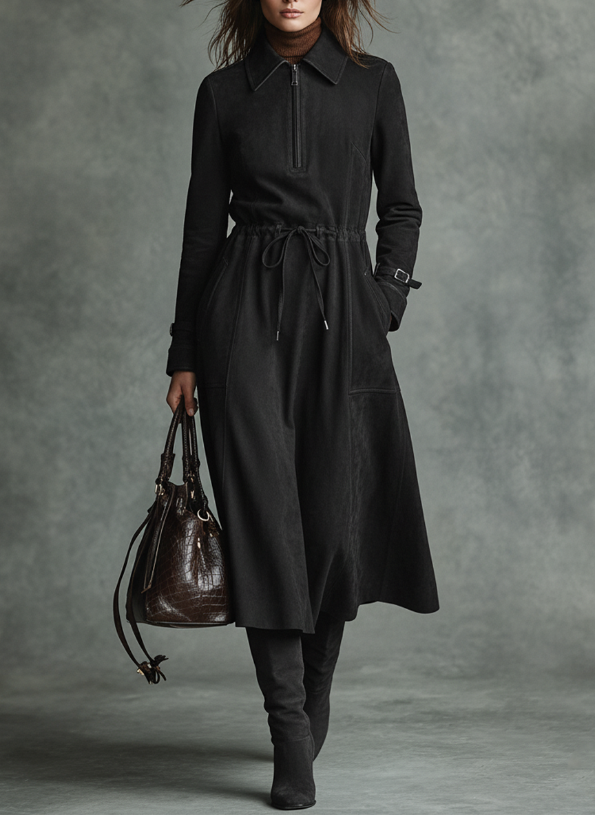 Women's Faux Suede Drawstring Zipper Lapel Midi Dress MDA2802J5Y