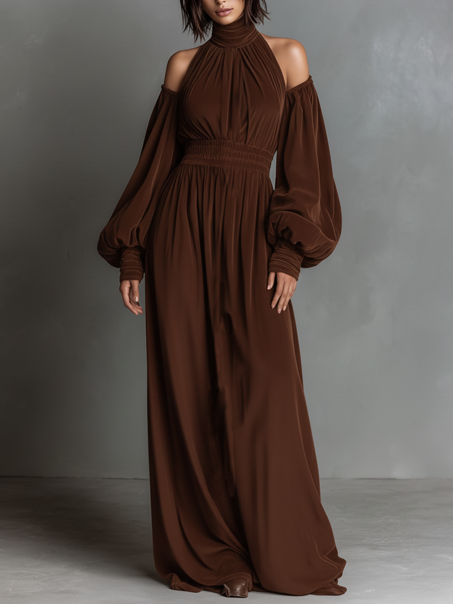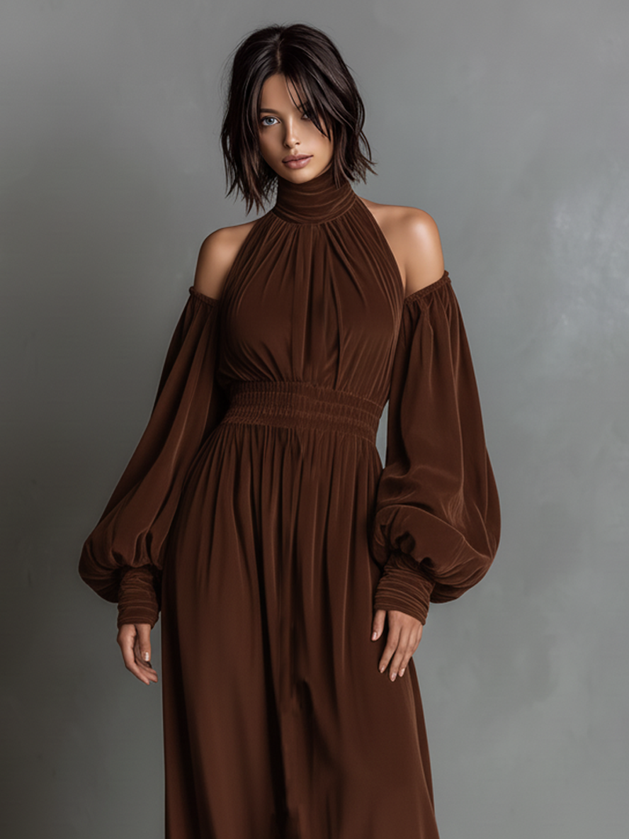 Women's Dark Brown High-Elastic Knit Pleated Slim Fit Long-Sleeved Maxi Dress MDA0663K7T