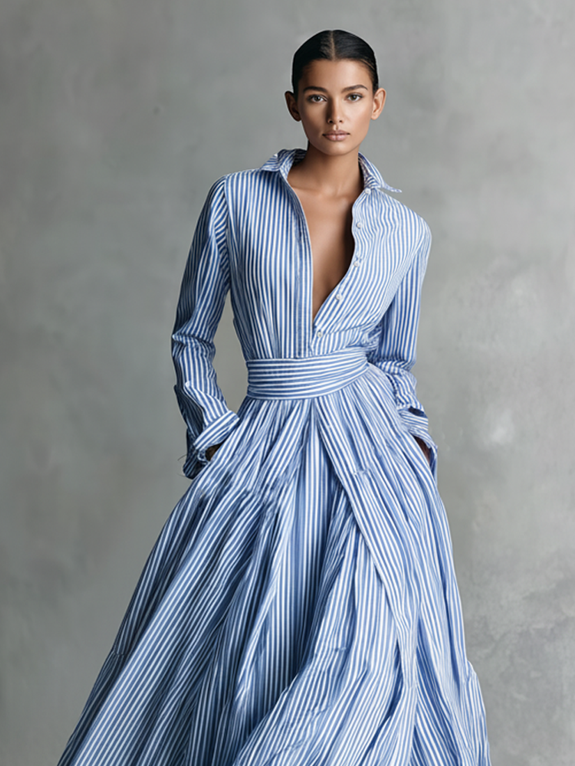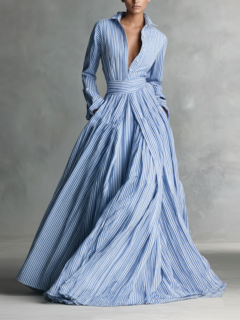 Women's Striped Polyester-cotton Blend Shirt Collar Belt Maxi Dress MDA0656K7Y