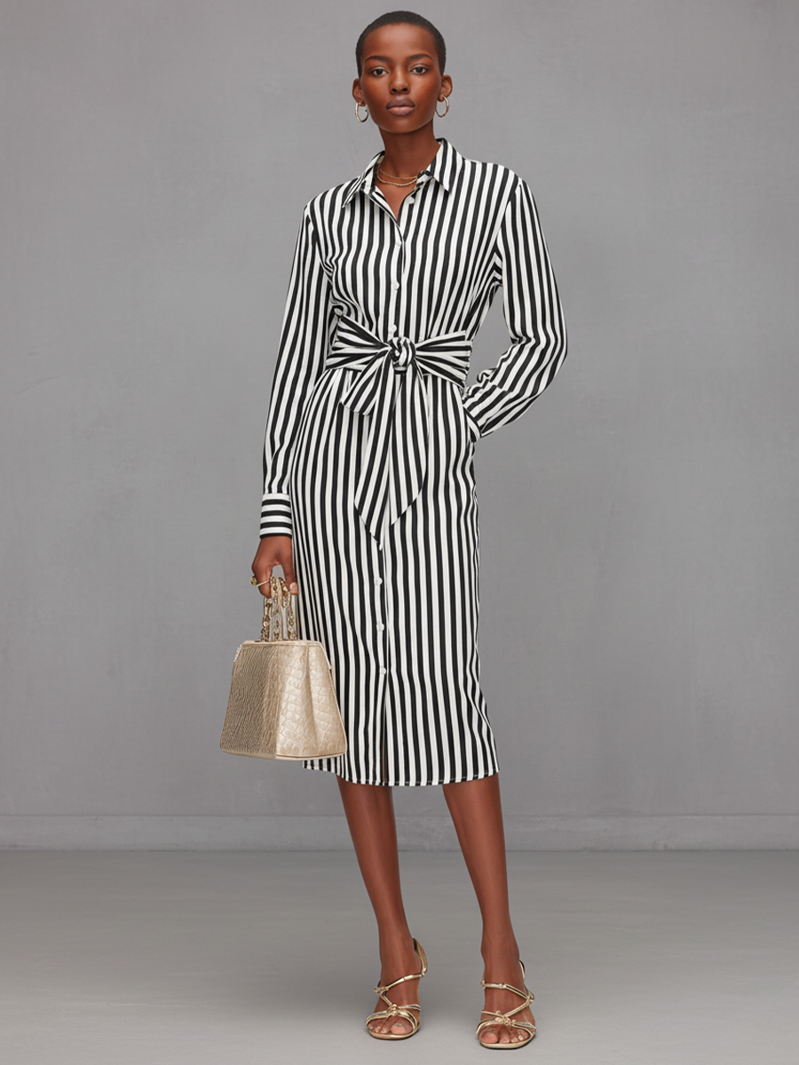 Women's Black-and-White Striped Fabric Collared Shirt Dress With Bow Belt MDA2220L4T