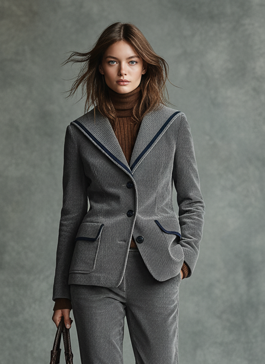 Women's Corduroy Sailor Collar Suit Jacket And Straight Leg Pants Set MDA0600K6Y