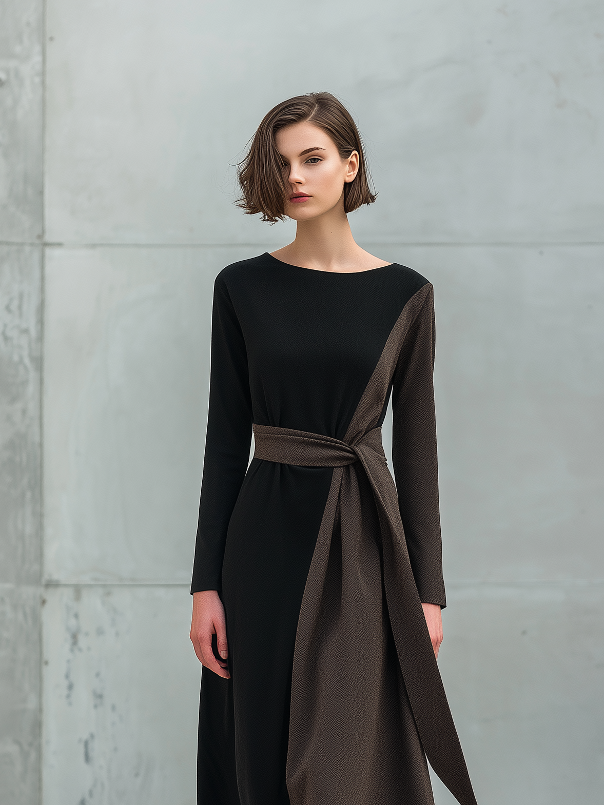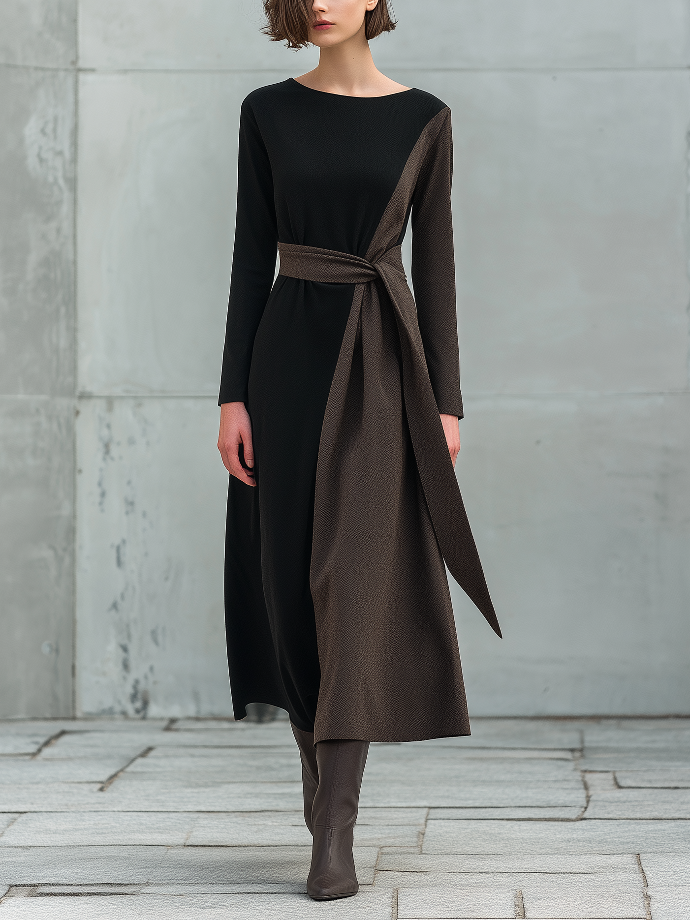 Women's Elegant Black And Brown Patchwork Woven Long-sleeved Loose Maxi Dress With Belt MDA2510L7AN