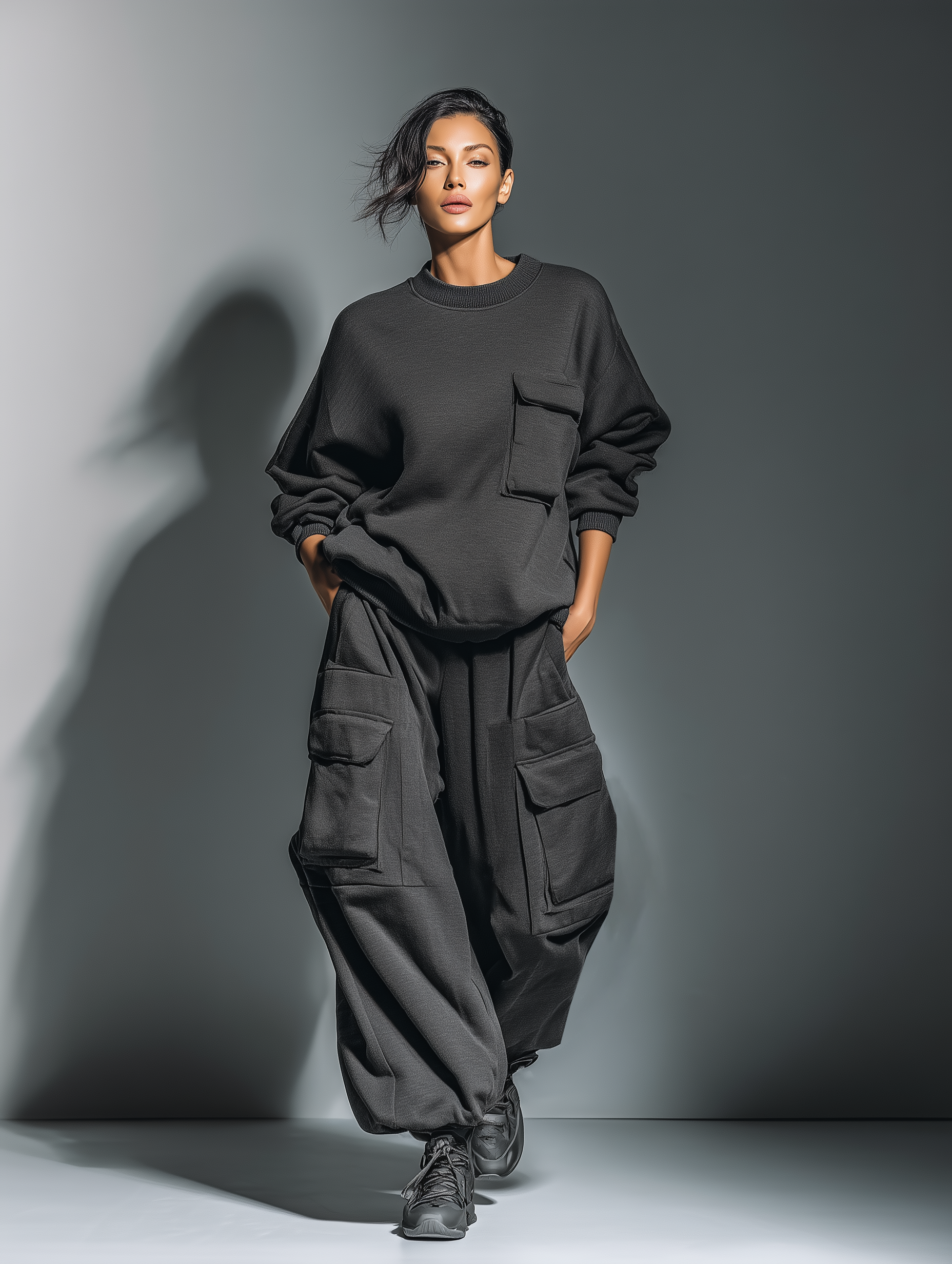 Women's Black Knit Fabric Oversized Pocketed Sweatshirt & Cargo Pants Set MDA2445L8T