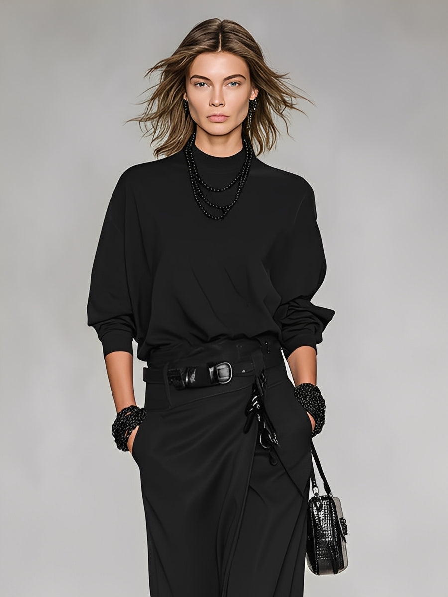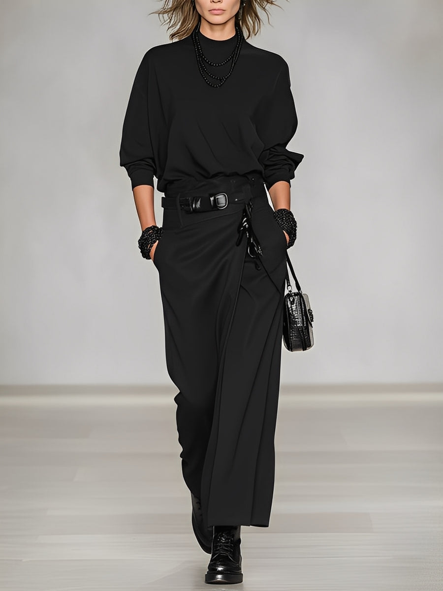Women's Black Skirt Set With Turtleneck & Wrap Waist Detail, Modern Sophisticated-Effortless Style Set MDA2589L3I