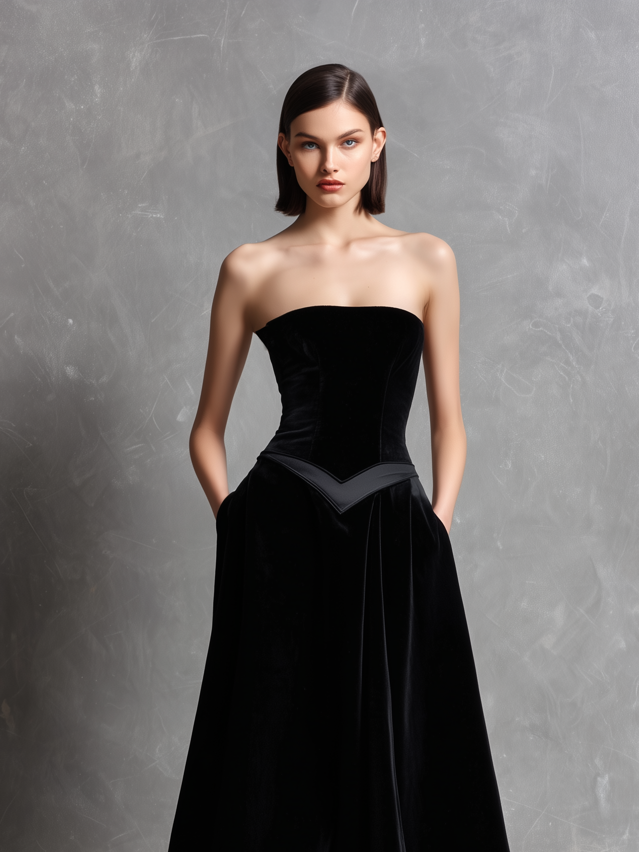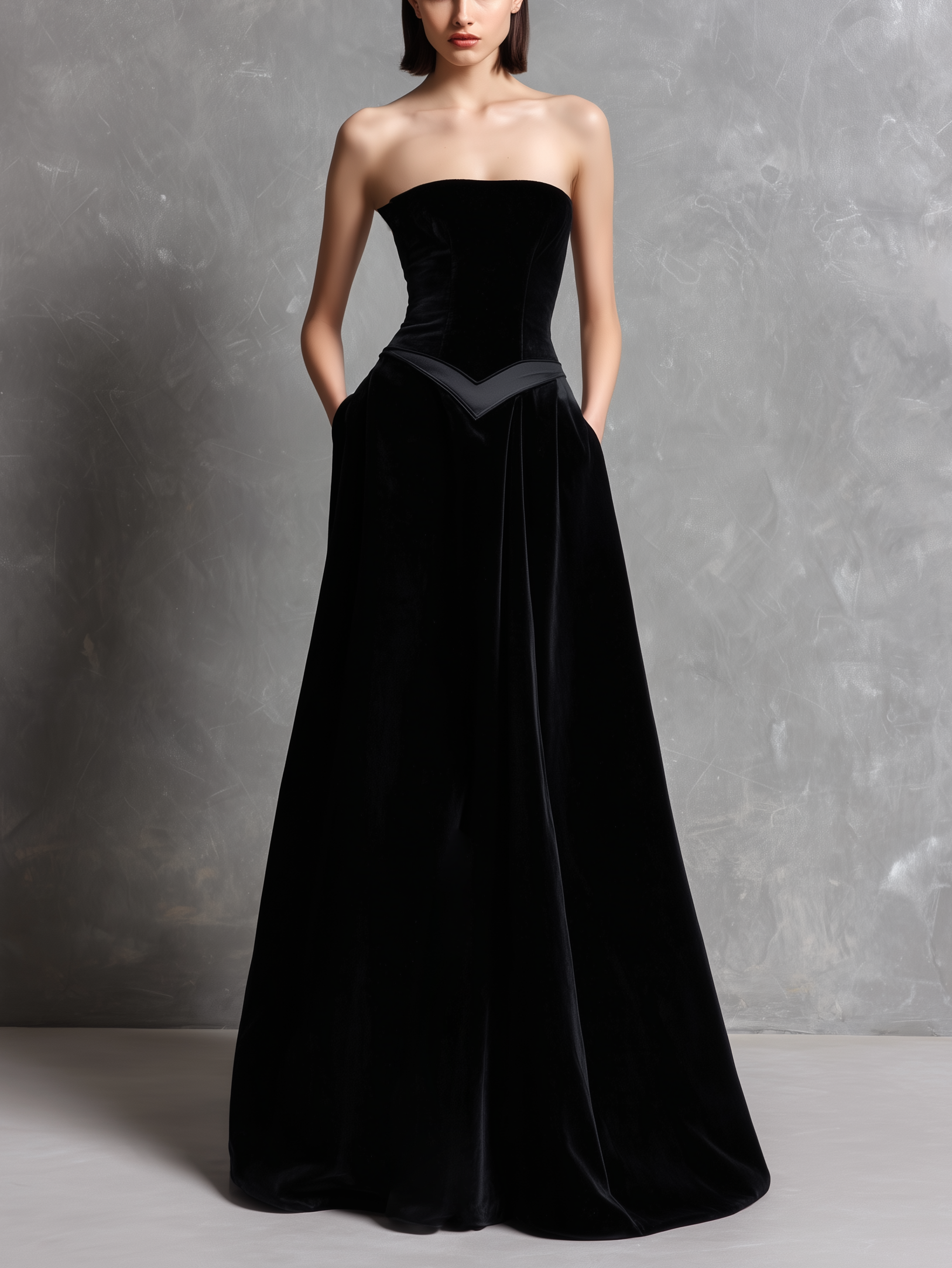 Women's Elegant Black Velvet Strapless Long Evening Dress MDA2522L5AN