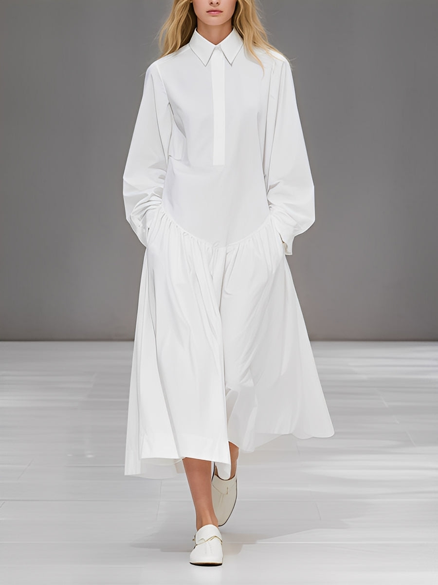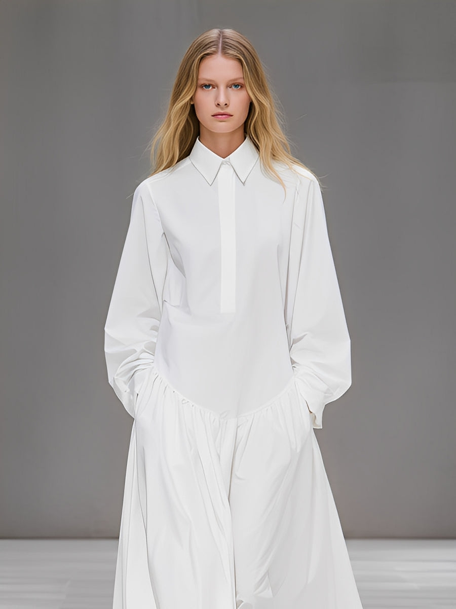 Women's Crisp White Cotton-Blend Dress With Polo Collar & Pleated Skirt, Timeless Minimalist-Chic Style Dress MDA2548L5I