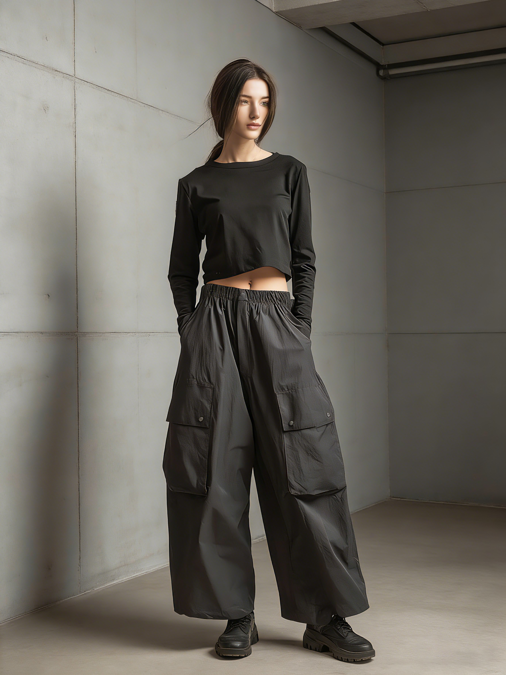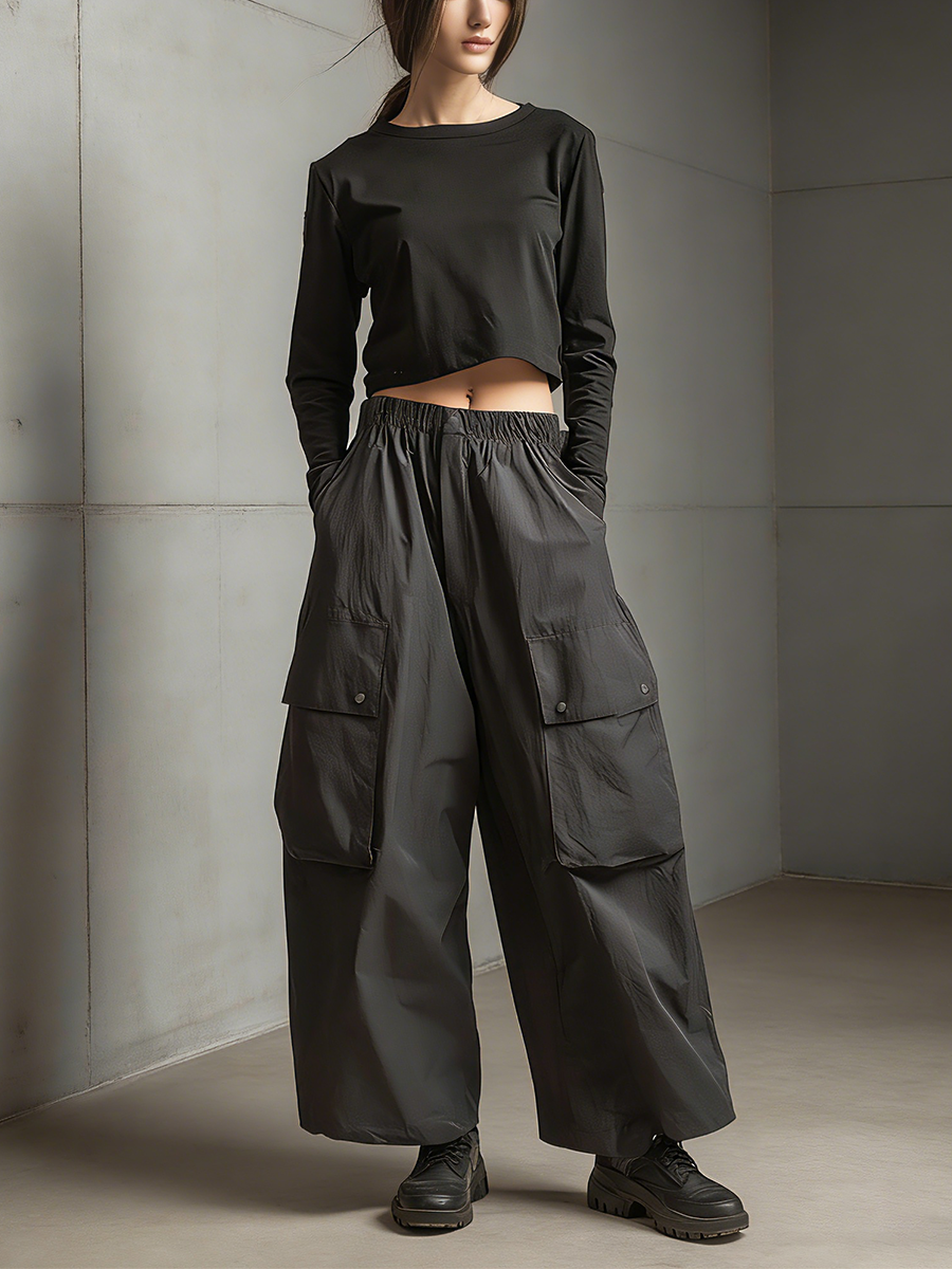 Women's Black Cotton-blend Short-sleeved Top And Charcoal Gray High-waisted Cargo Pants Set MDA2519L8T