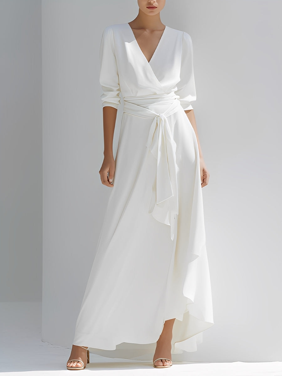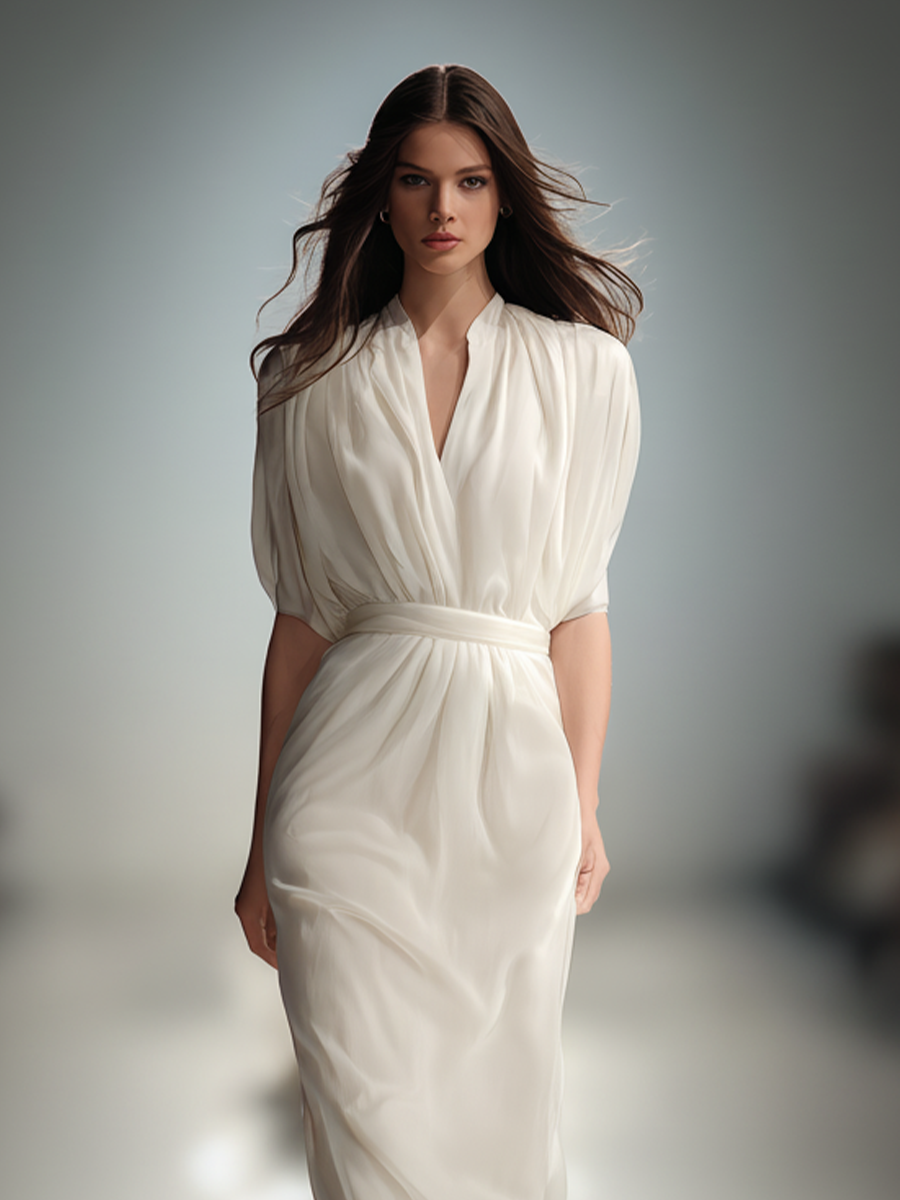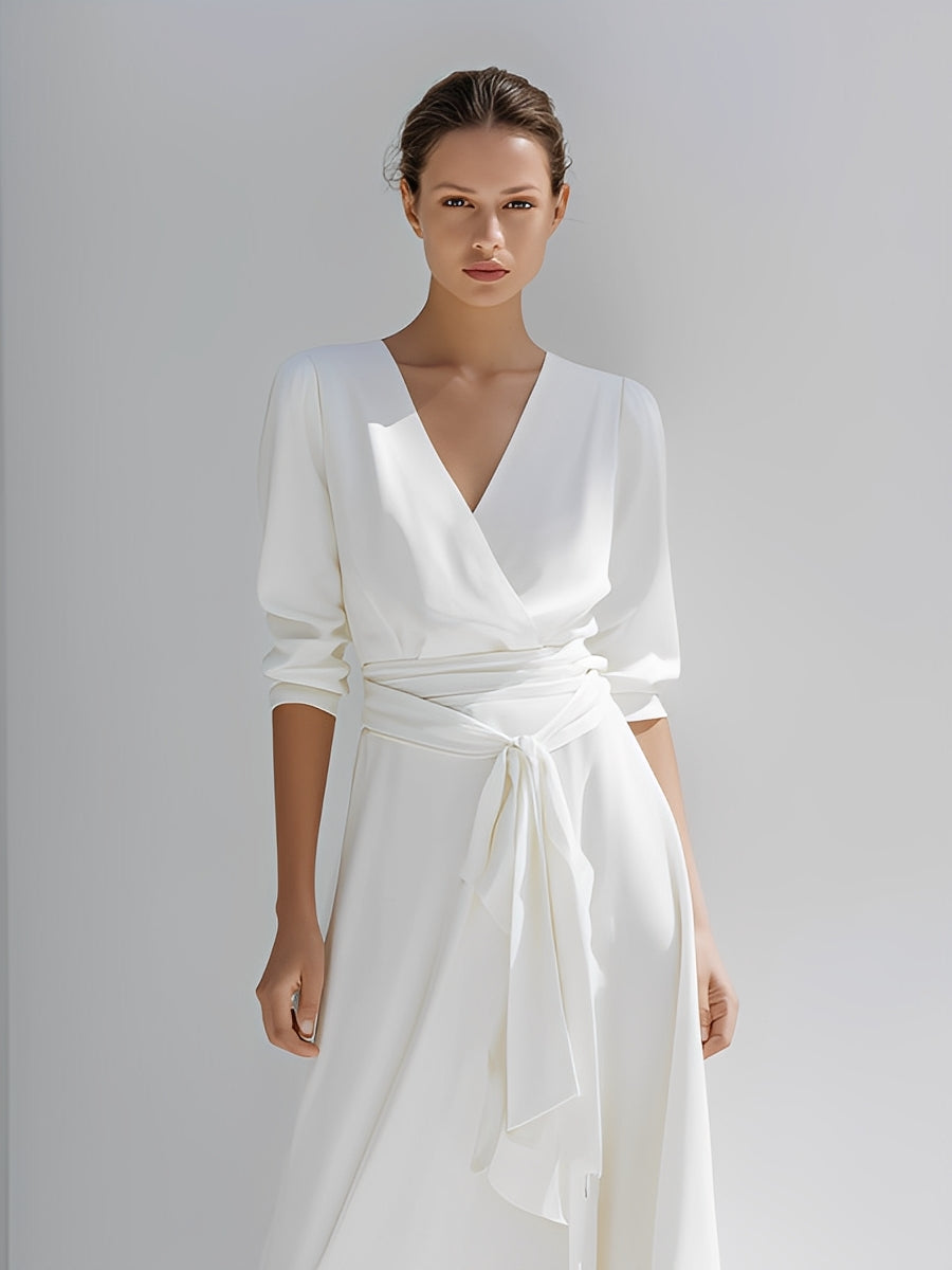Women's Ivory Flowy Dress With Wrap Silhouette & Asymmetric Hem, Modern Effortless-Sophisticated Style Dress MDA2582L3I