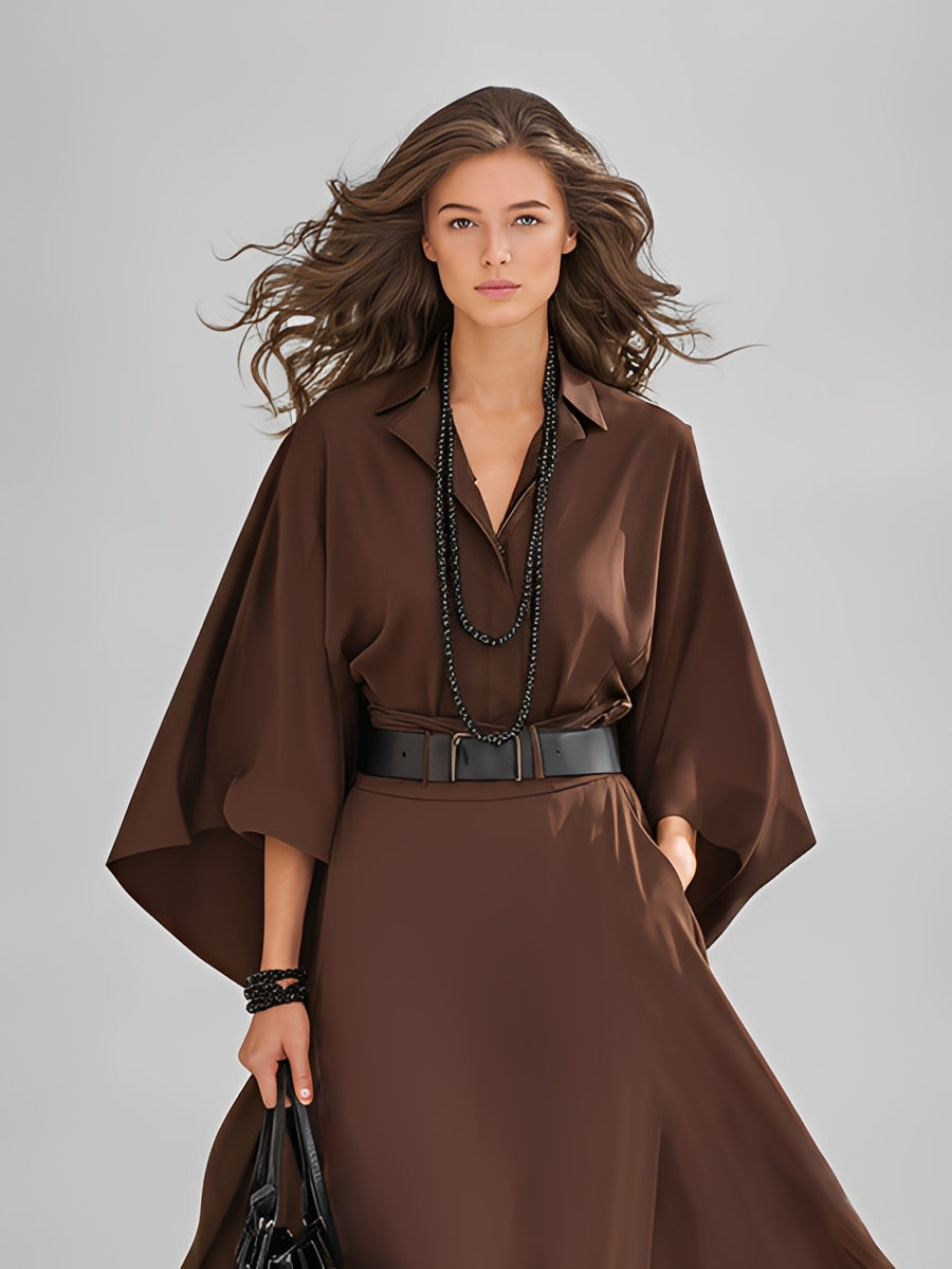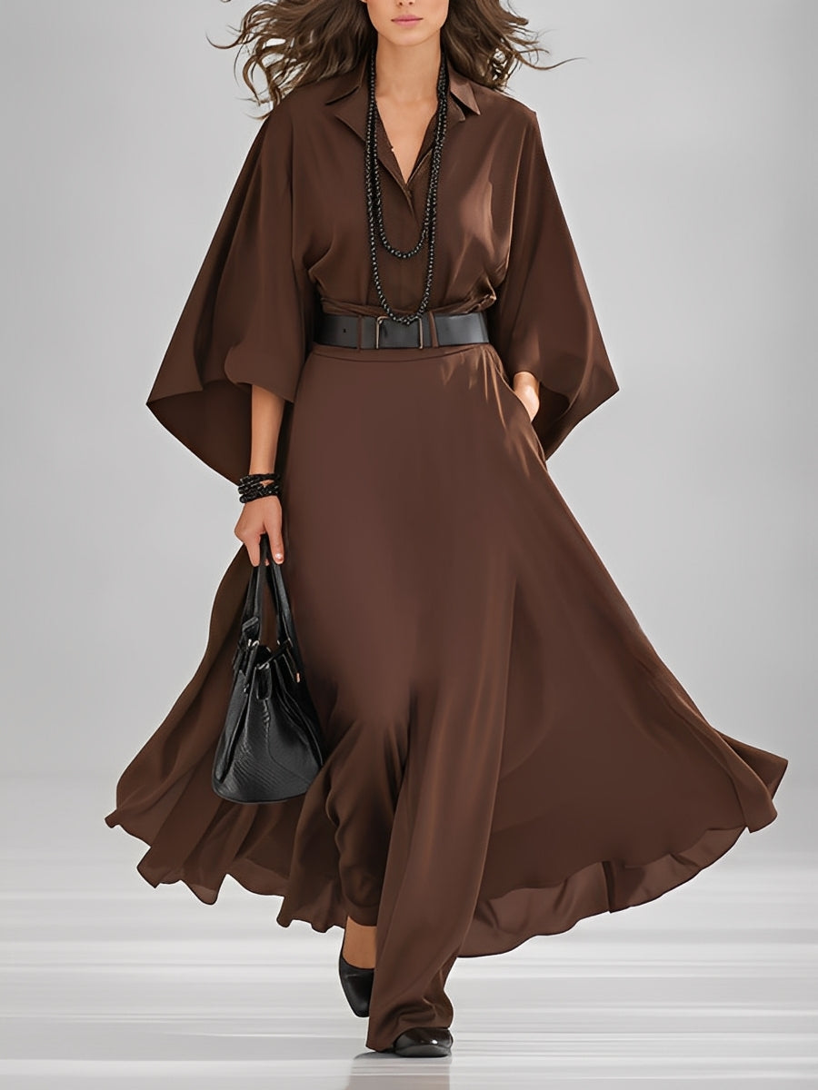 Women's Dark Brown Woven Set With Wide Sleeves & Maxi Skirt, Modern Sophisticated-Effortless Style Set (without Belt) MDA2500L2I