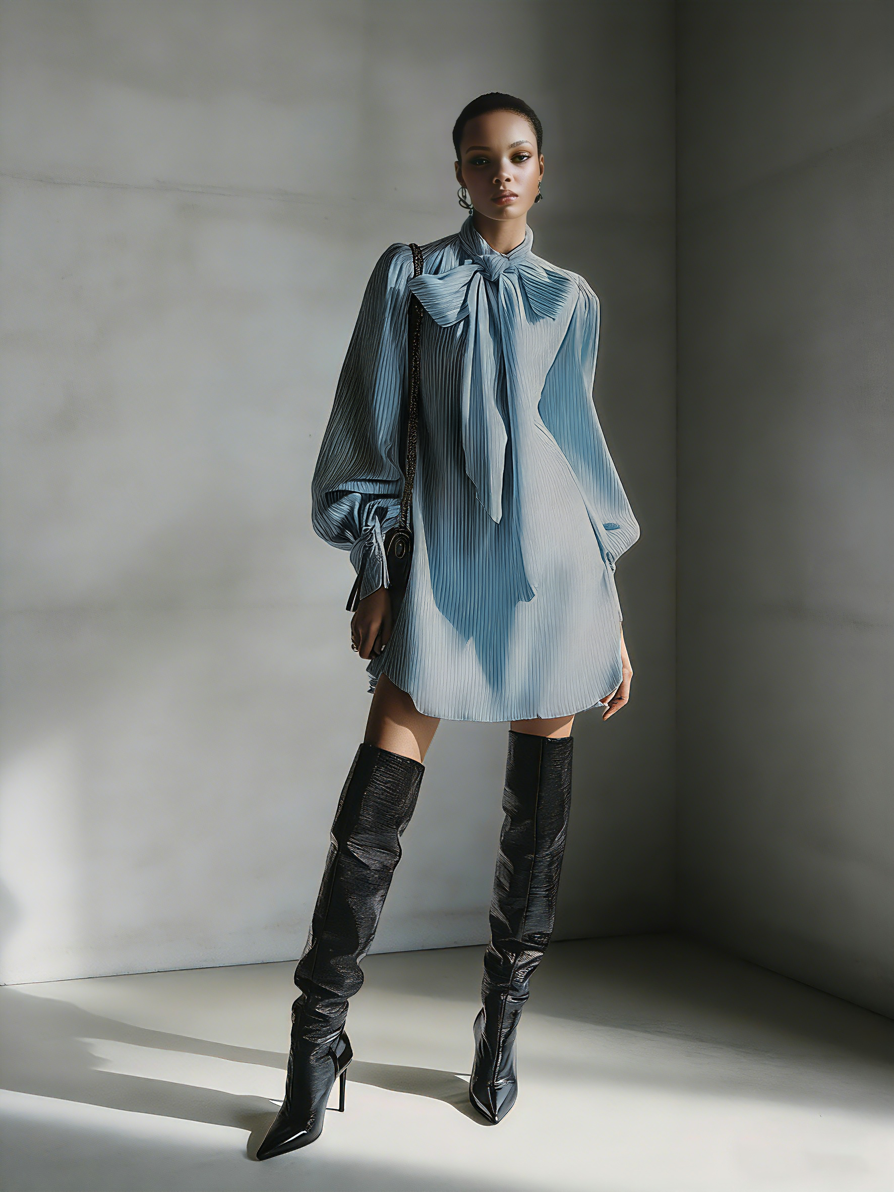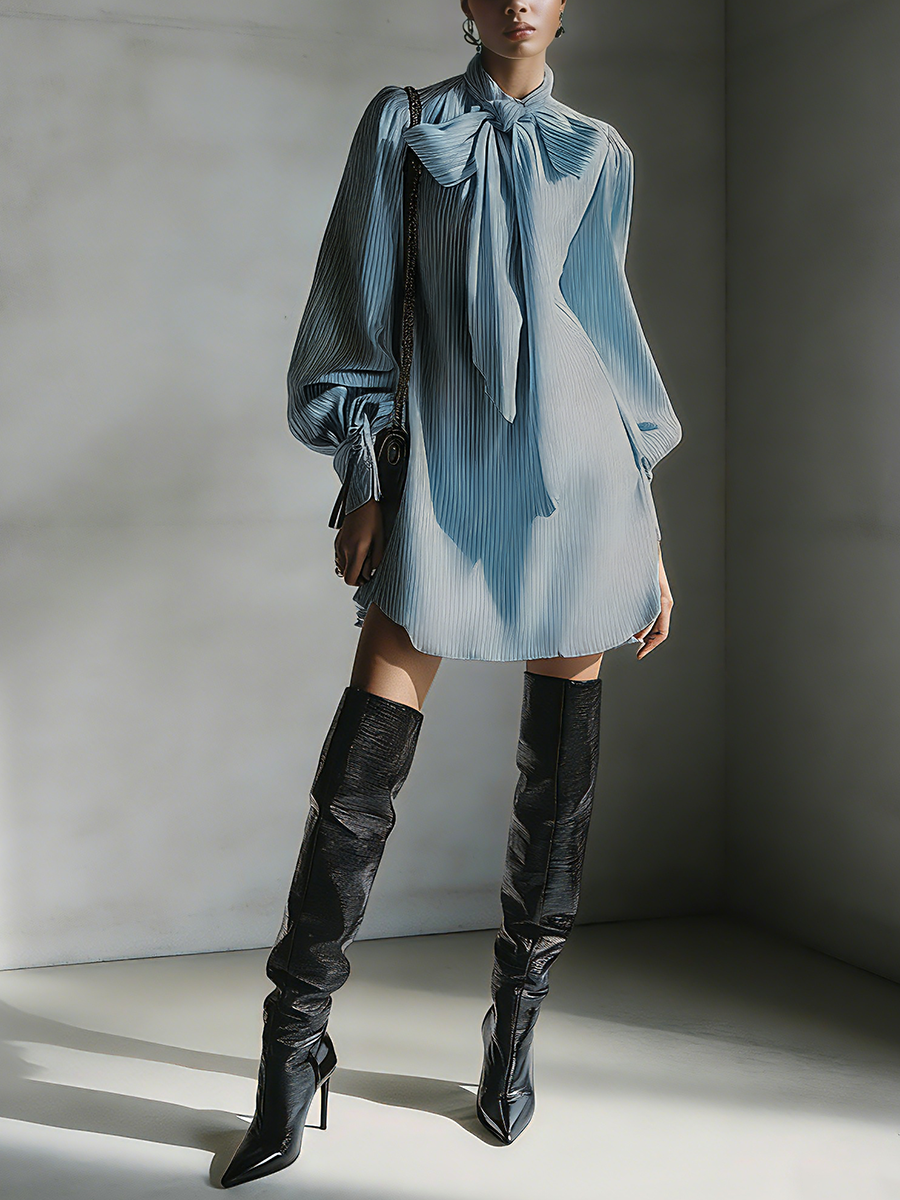 Women's Light Blue Striped Cotton Blend Fabric Bow-Neck Puff-Sleeve Mini Shirt Dress MDA2569L4T