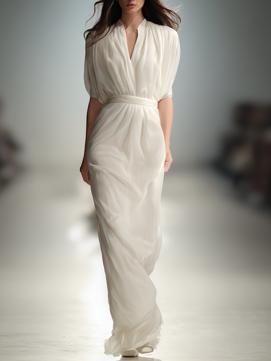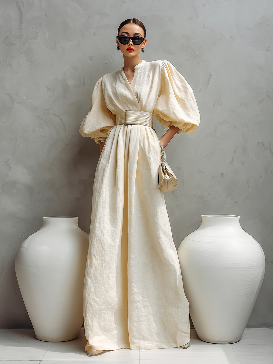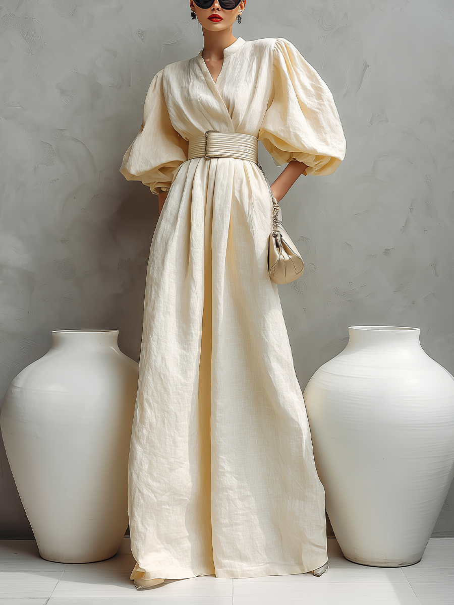 Women's Cream Linen Fabric V-Neck Puff-Sleeve Belted Maxi Dress MDA2540L9T