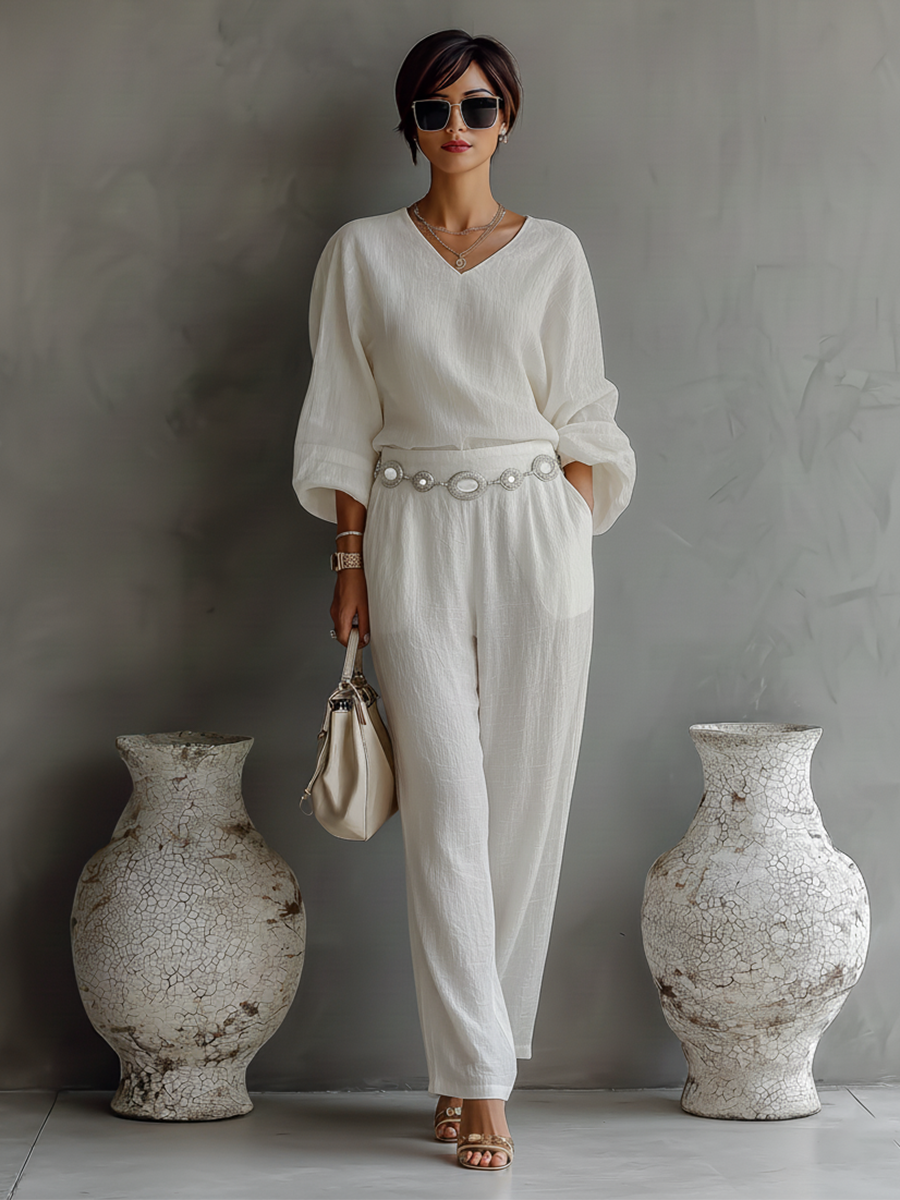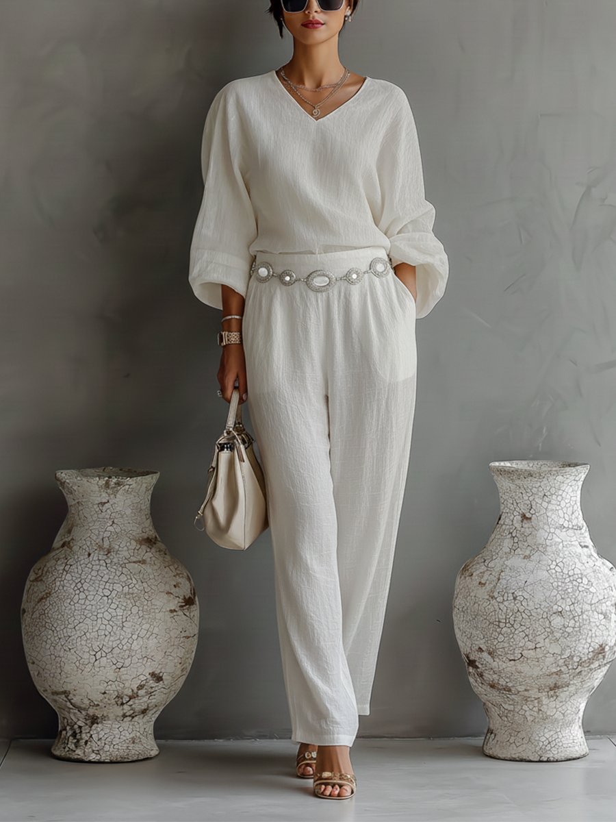 Women's Off-white Cotton And Linen Long-sleeved Top And Trousers Set MDA2525L6T