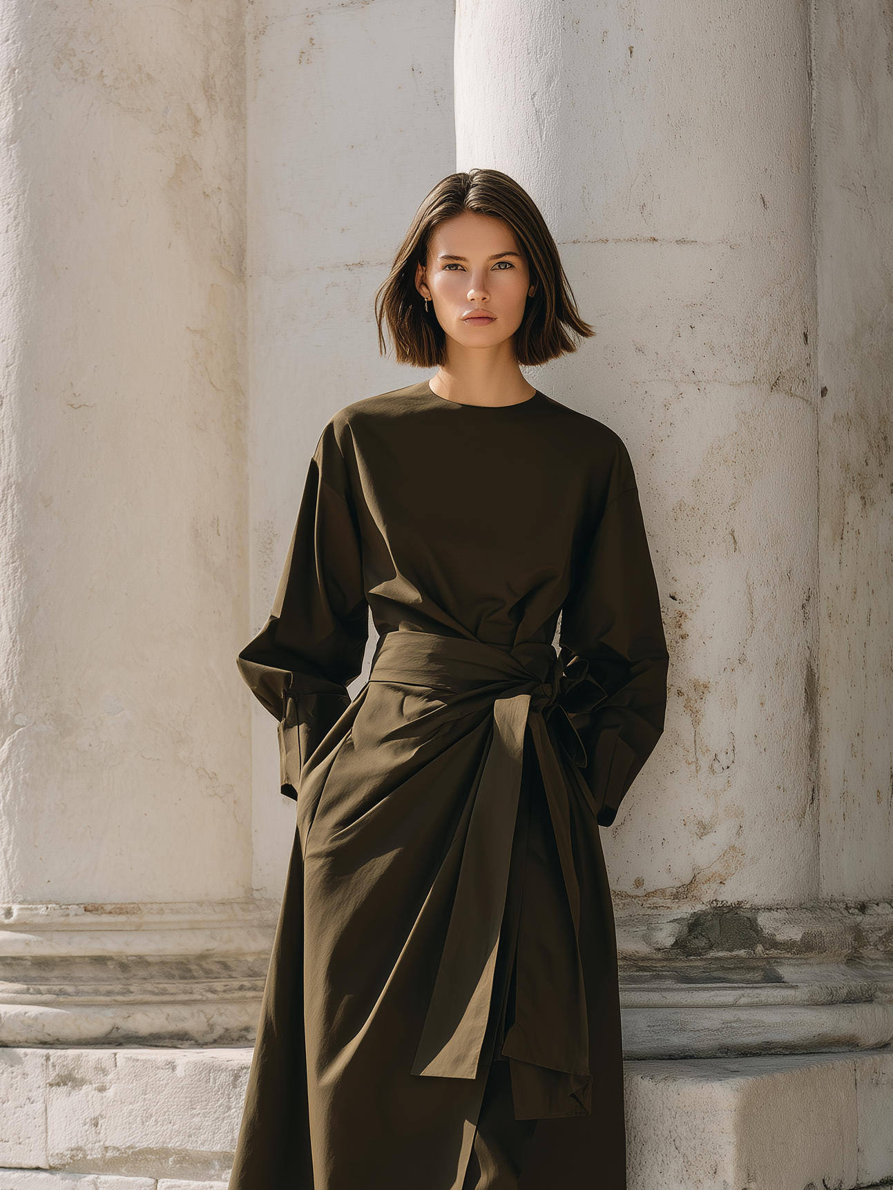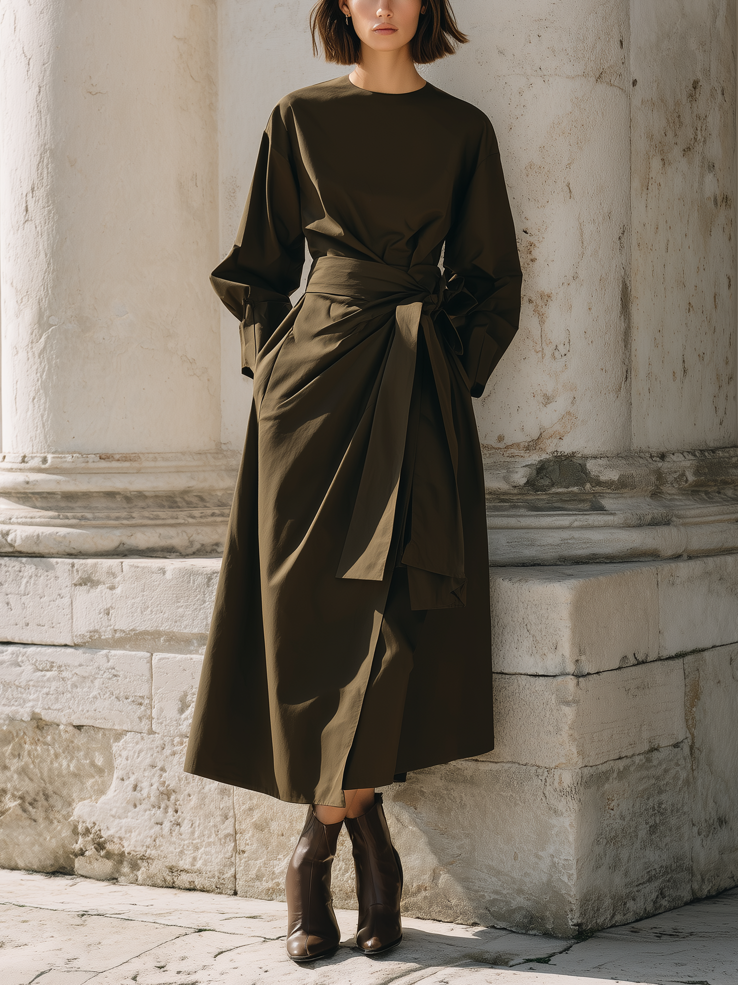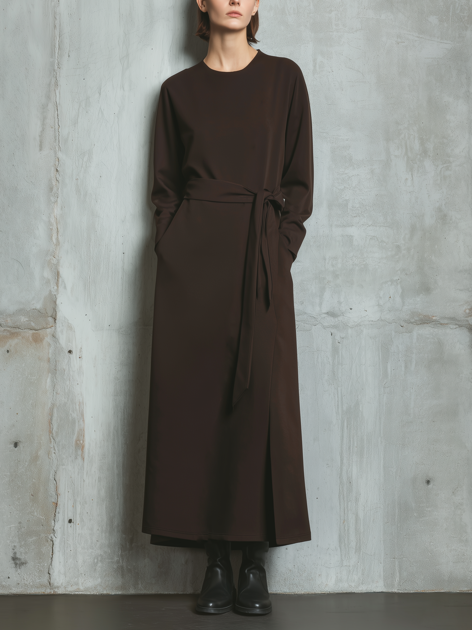 Women's Elegant Brown Round-neck Woven Loose-fitting Long-sleeved Maxi Dress With Belt MDA2548L1AN