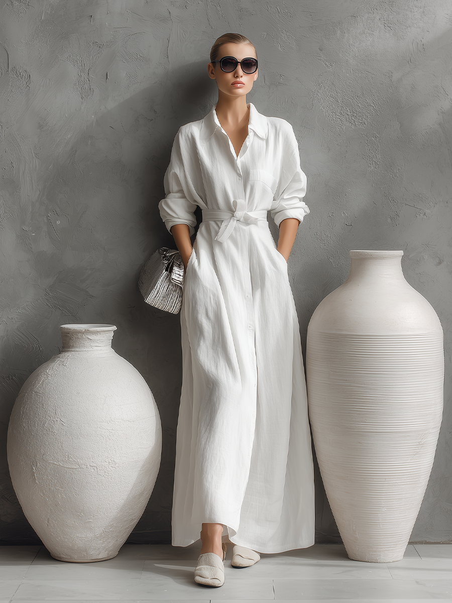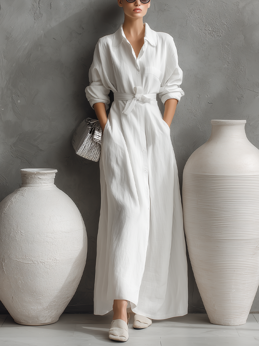 Women's White Linen Fabric Collared Belted Maxi Shirt Dress MDA2561L4T