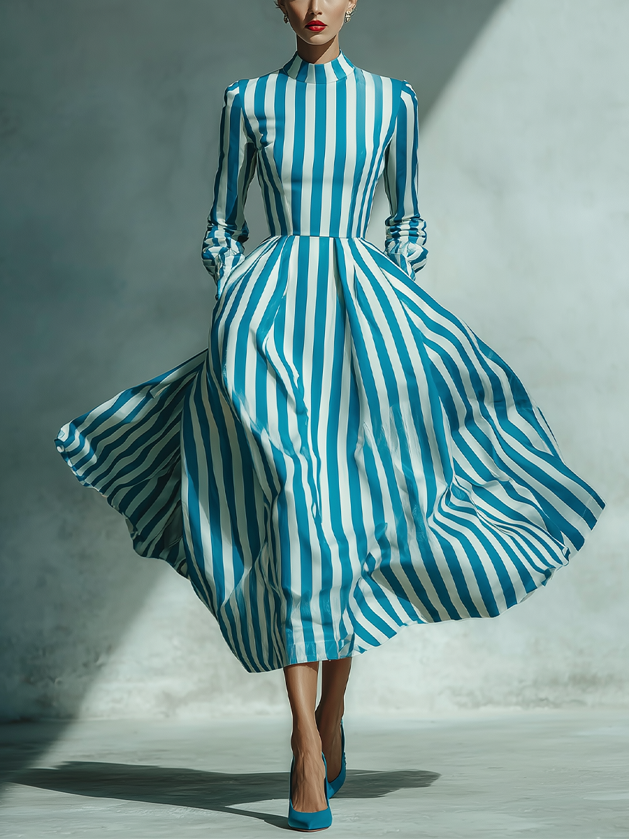 Women's Turquoise-and-White Cotton Blend Mock-Neck Puff-Sleeve Flared Midi Dress MDA1902L3T