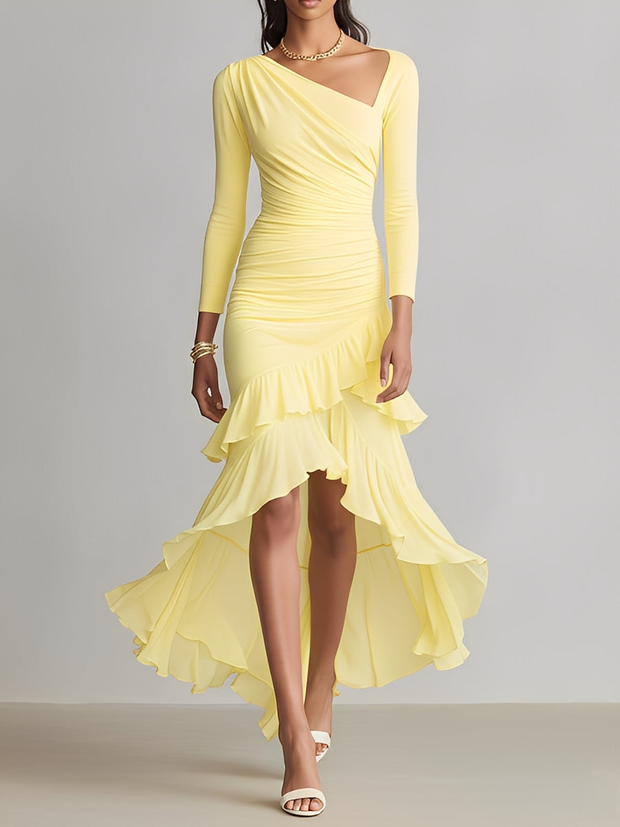 Women's Yellow Flowy Dress With Asymmetric Neckline & Ruffled High-Low Hem, Sophisticated Evening-Cocktail Style Dress MDA2534L6I