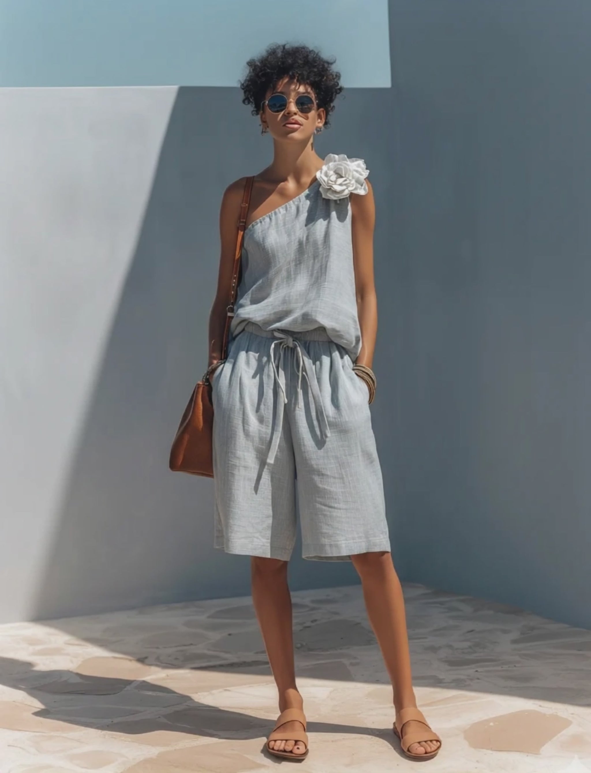A fresh and playful two-piece set crafted from breathable cotton-linen fabric in a soft light blue shade. Featuring an off-shoulder sleeveless top paired with matching shorts, this set is accented with a removable white floral embellishment for versatile styling.