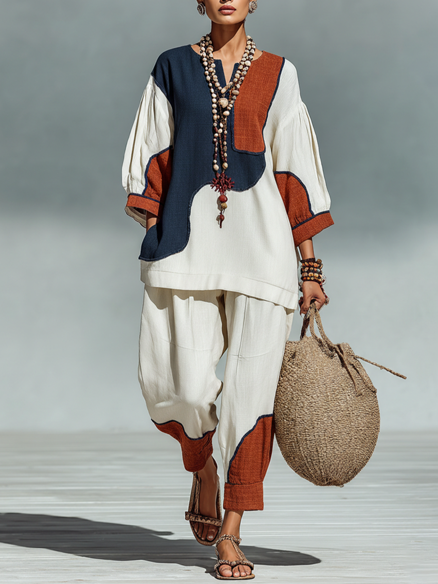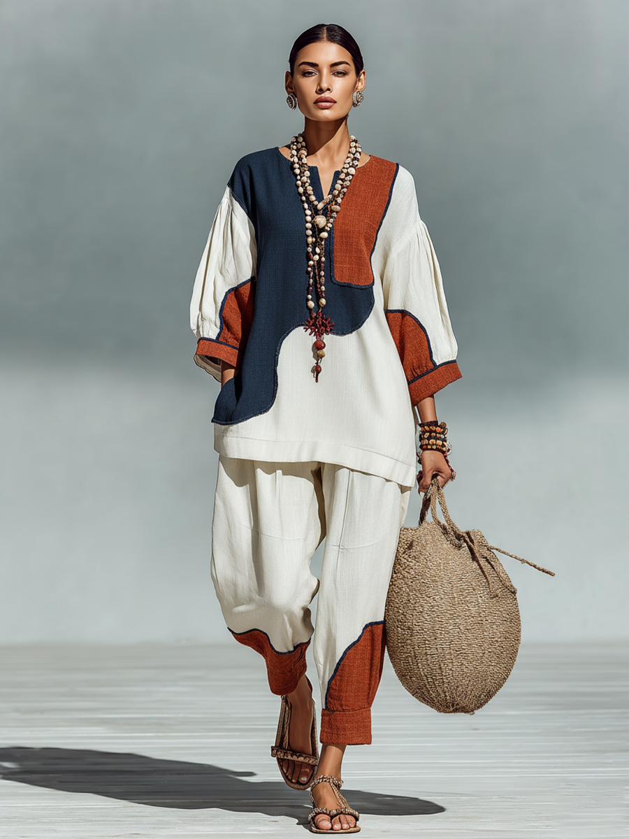 Women's Multicolor Patchwork Linen Set With Relaxed Fit & Patchwork Detail, Timeless Boho-Chic Style Set MDZ2700B6I