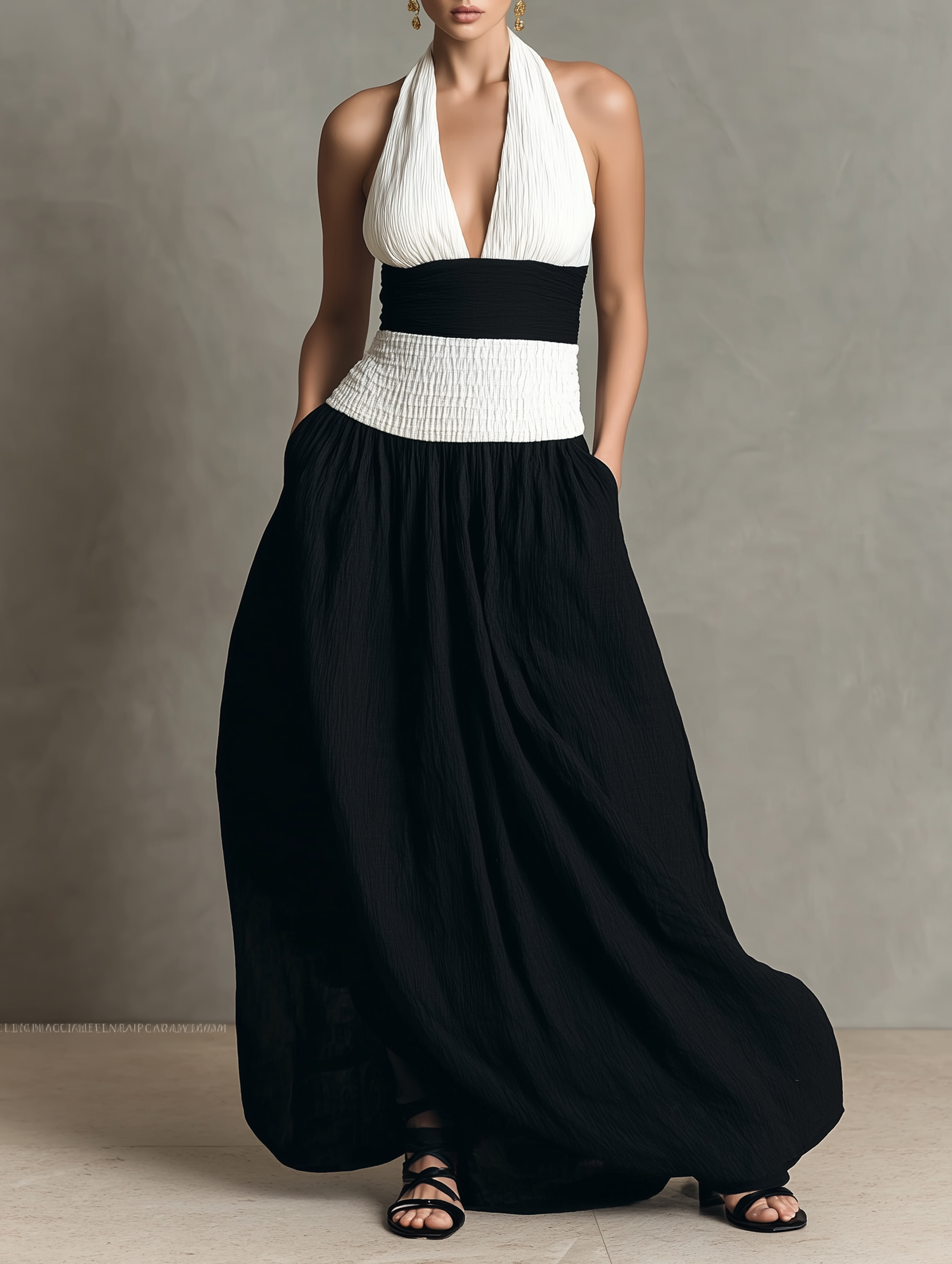 Women's Minimalist Halter Neck Color-blocked Maxi Dress MDZ2714B3Y