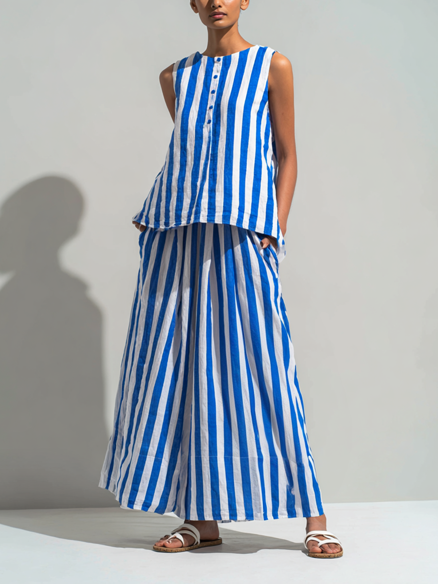 Women's Elegant Striped Printed Woven Round Neck Sleeveless Top Paired With Trousers Set MDZ2706B5AN