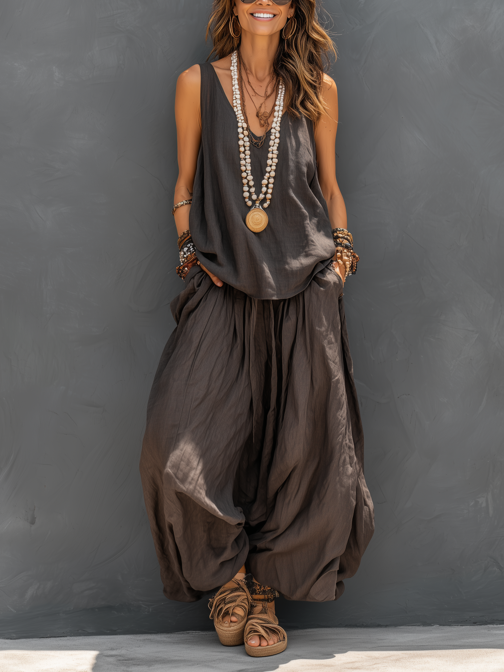 Women's Casual Dark Gray Cotton-linen Blend Sleeveless Vest Top Paired With Loose-fitting Trousers Set MDZ2714B2AN