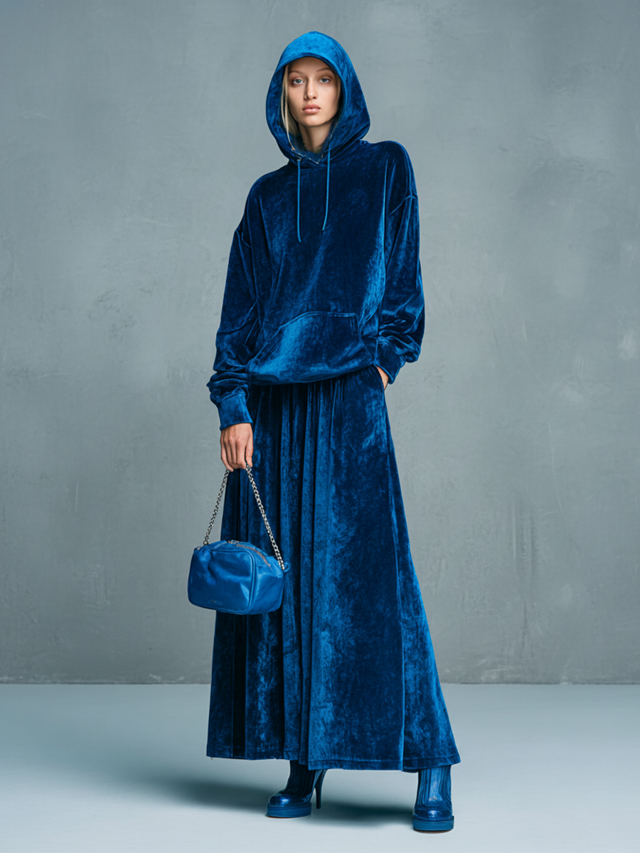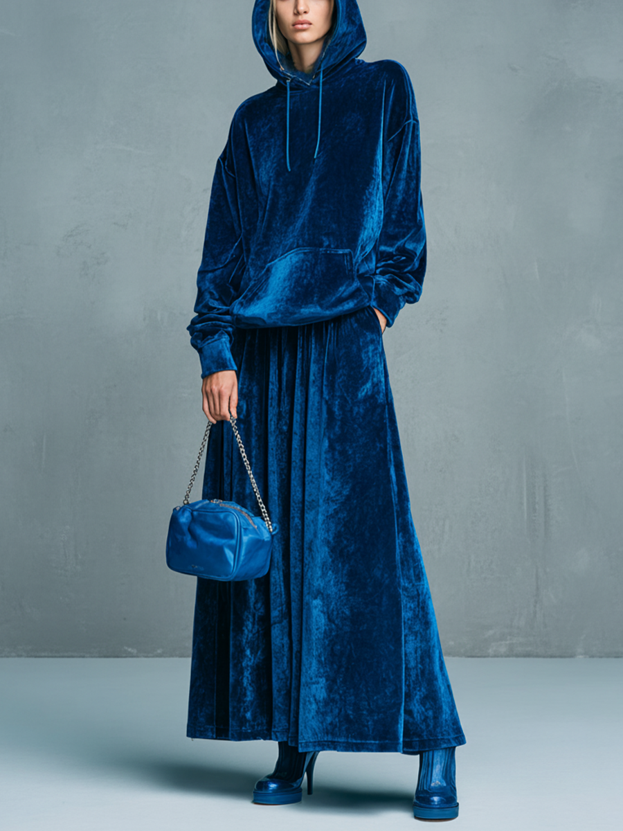 Women's Royal Blue Soft Velvet Fabric Hooded Sweatshirt & Pleated Maxi Skirt Set MDA1748L2T