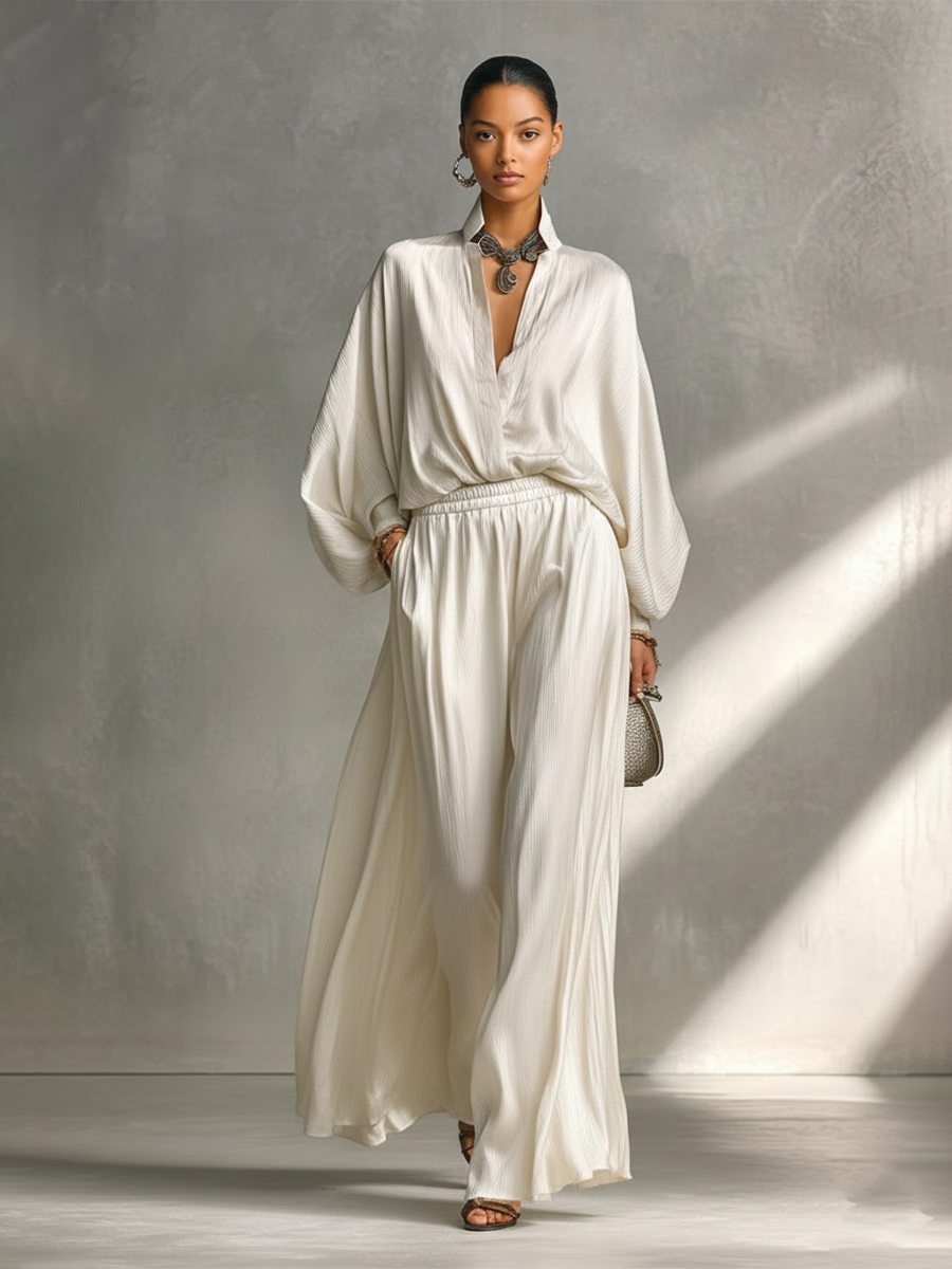 Women's Solid Color Lapel V-Neck Puff Sleeve Wide-Leg Pants Two-Piece Set MDA1831L6AP