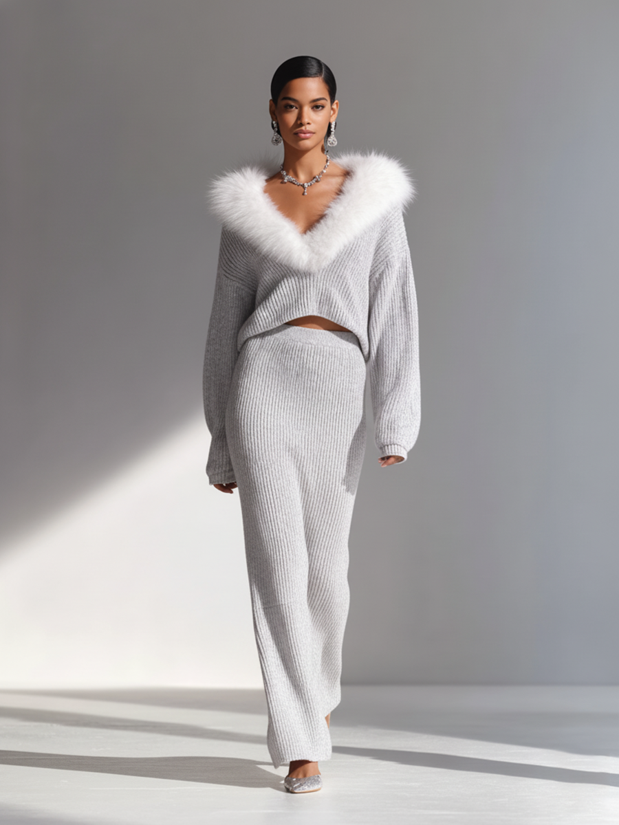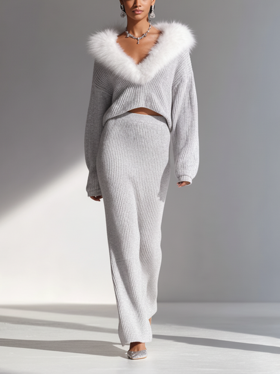 Women's Light Gray Ribbed Knit Top And Long Skirt Set With Faux Fur Collar MDA1590L3AP