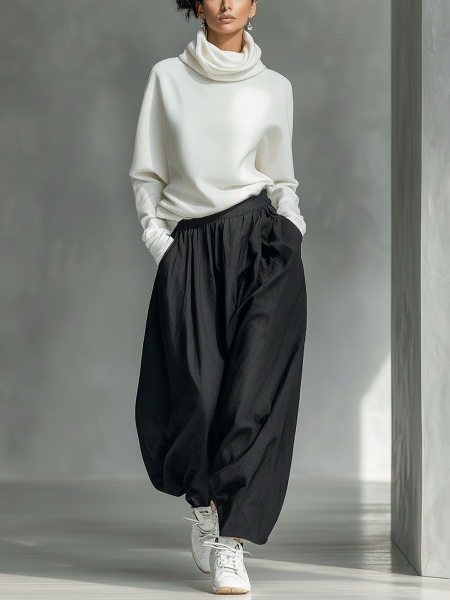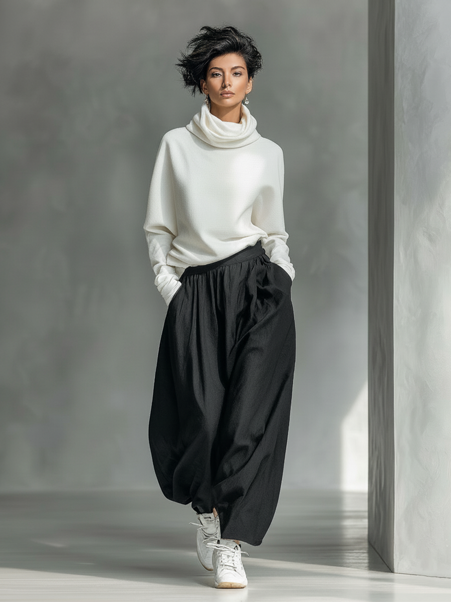 Women's Ivory Knit Fabric Oversized Turtleneck Top & Black Voluminous Balloon Pants Set MDA1957L9T